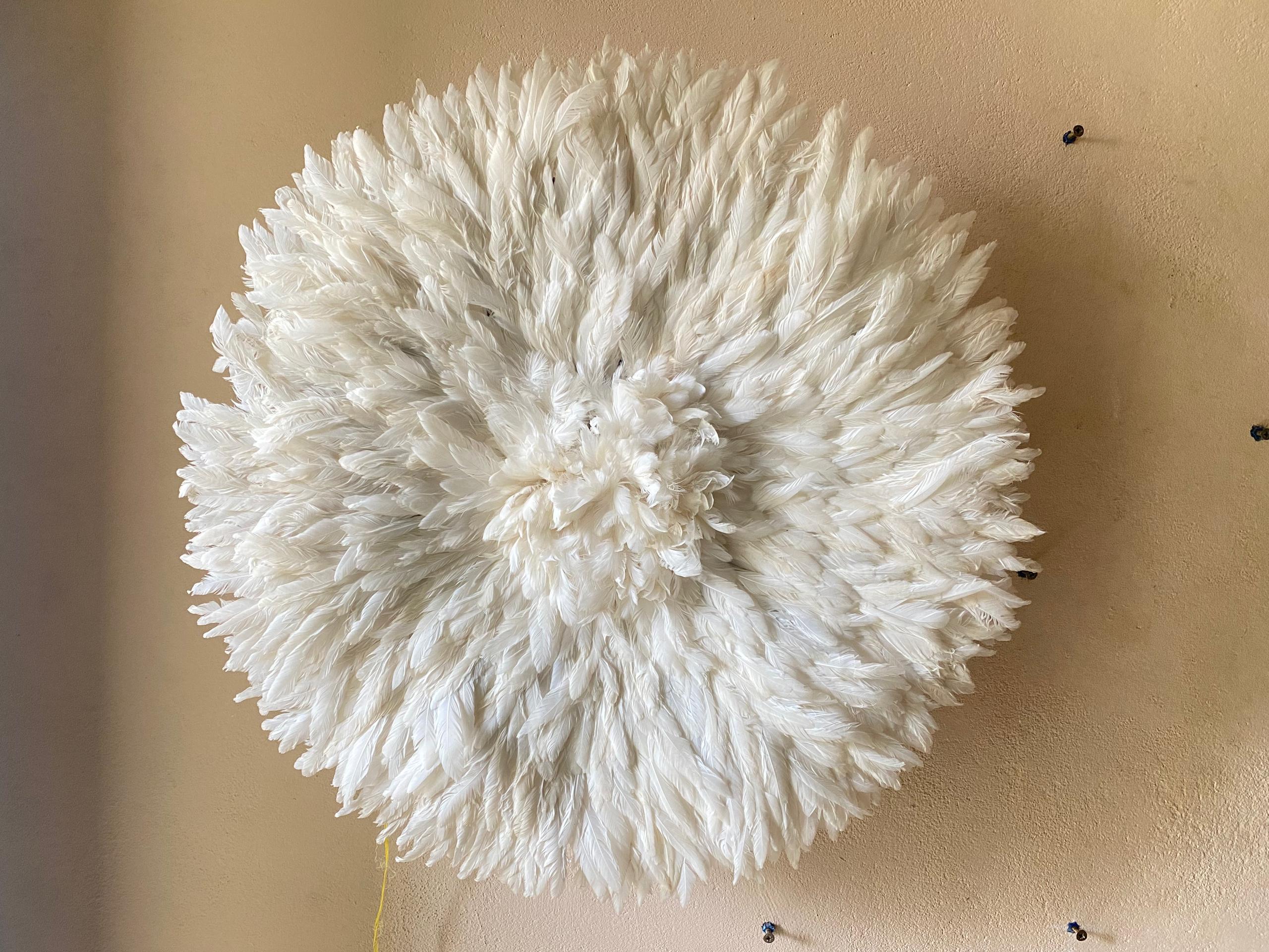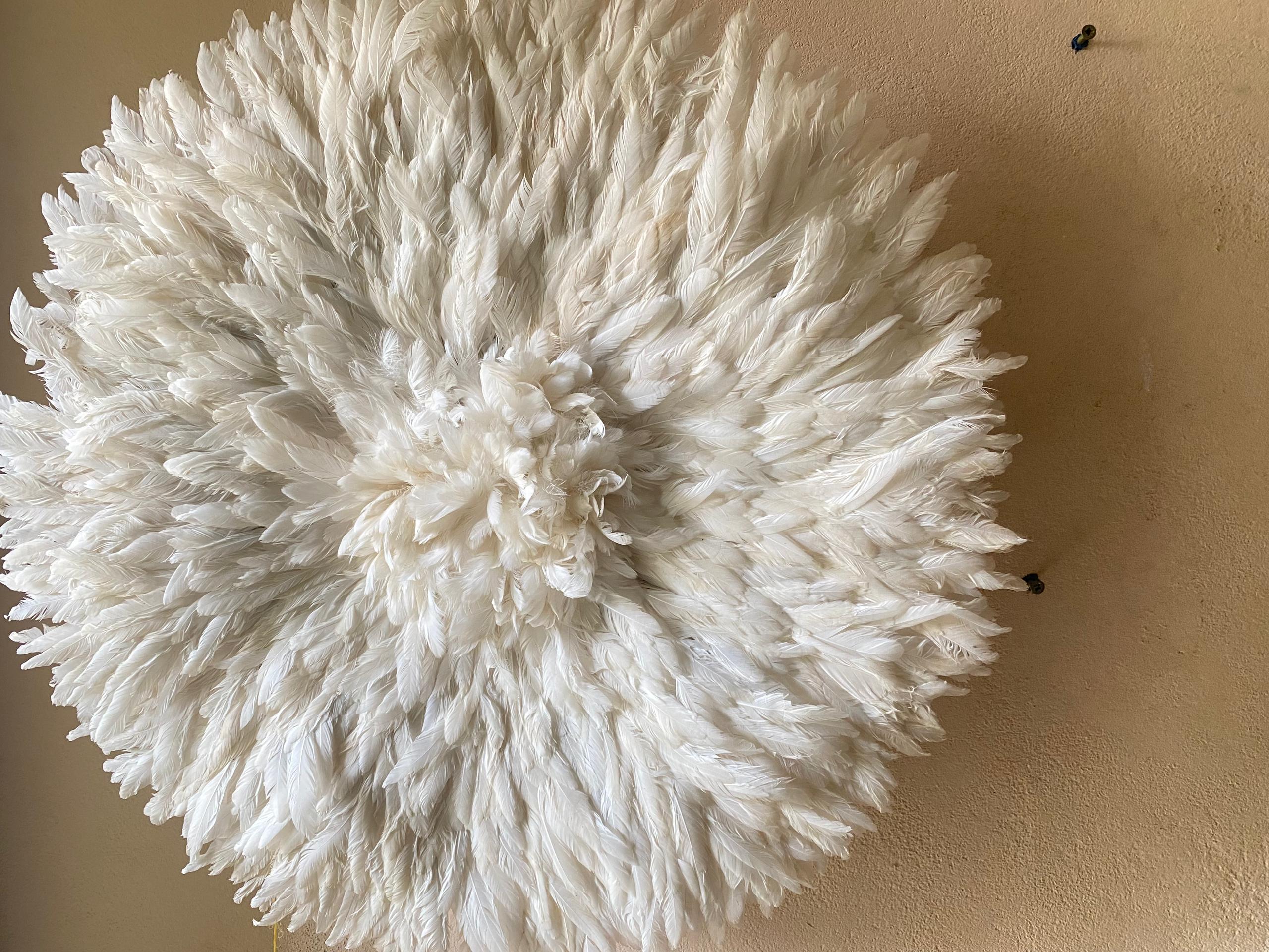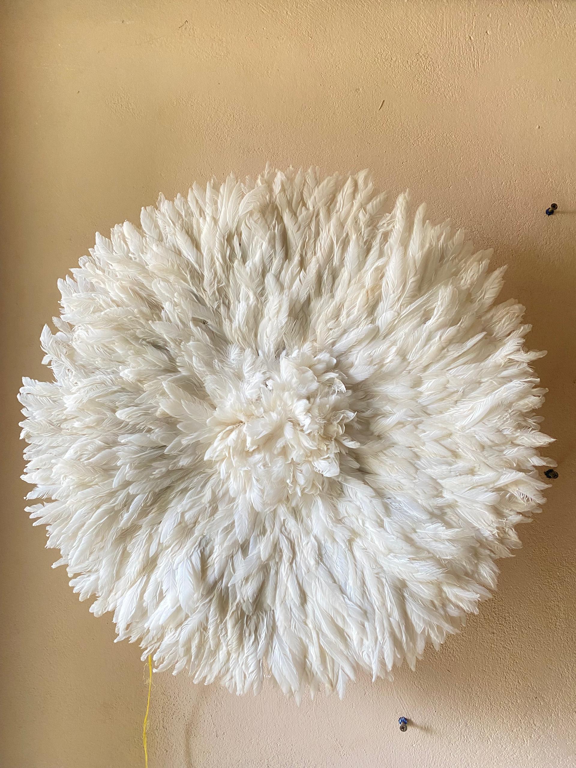 ✨ Fluffy White Feather Juju Hat Wall DecorTransform your space by Bringing elegance, culture, and texture into your home  – a true symbol of African artistry.
