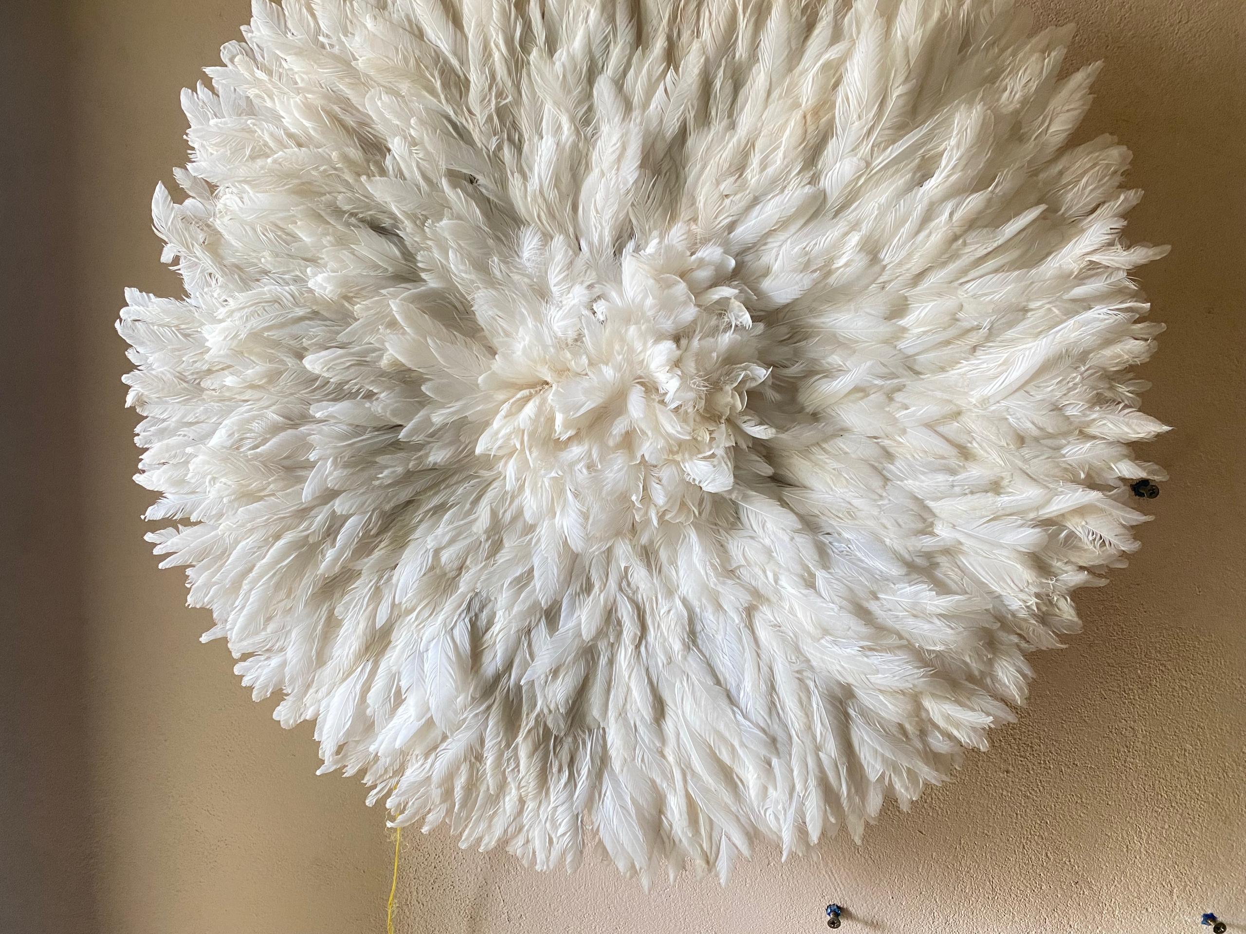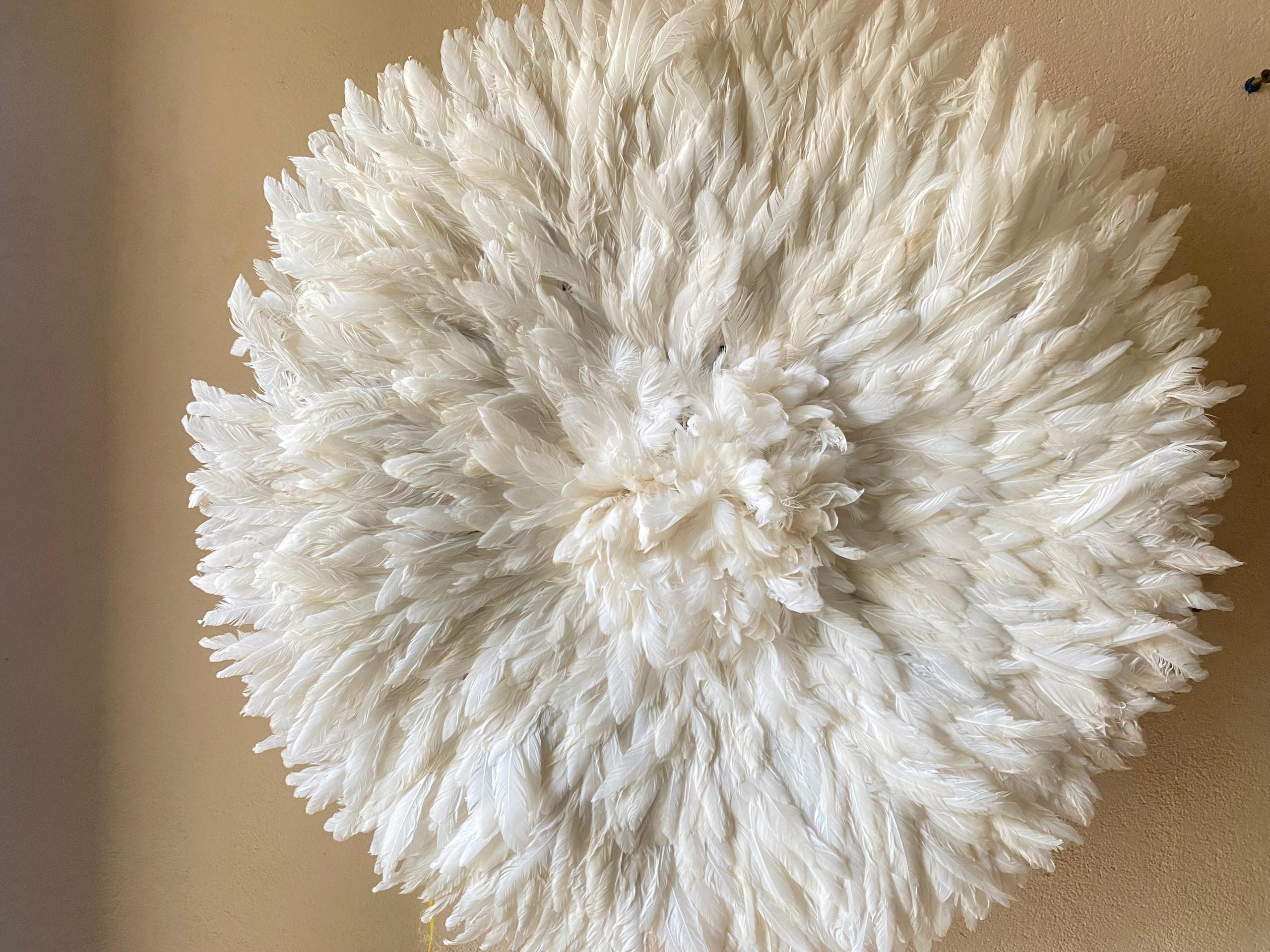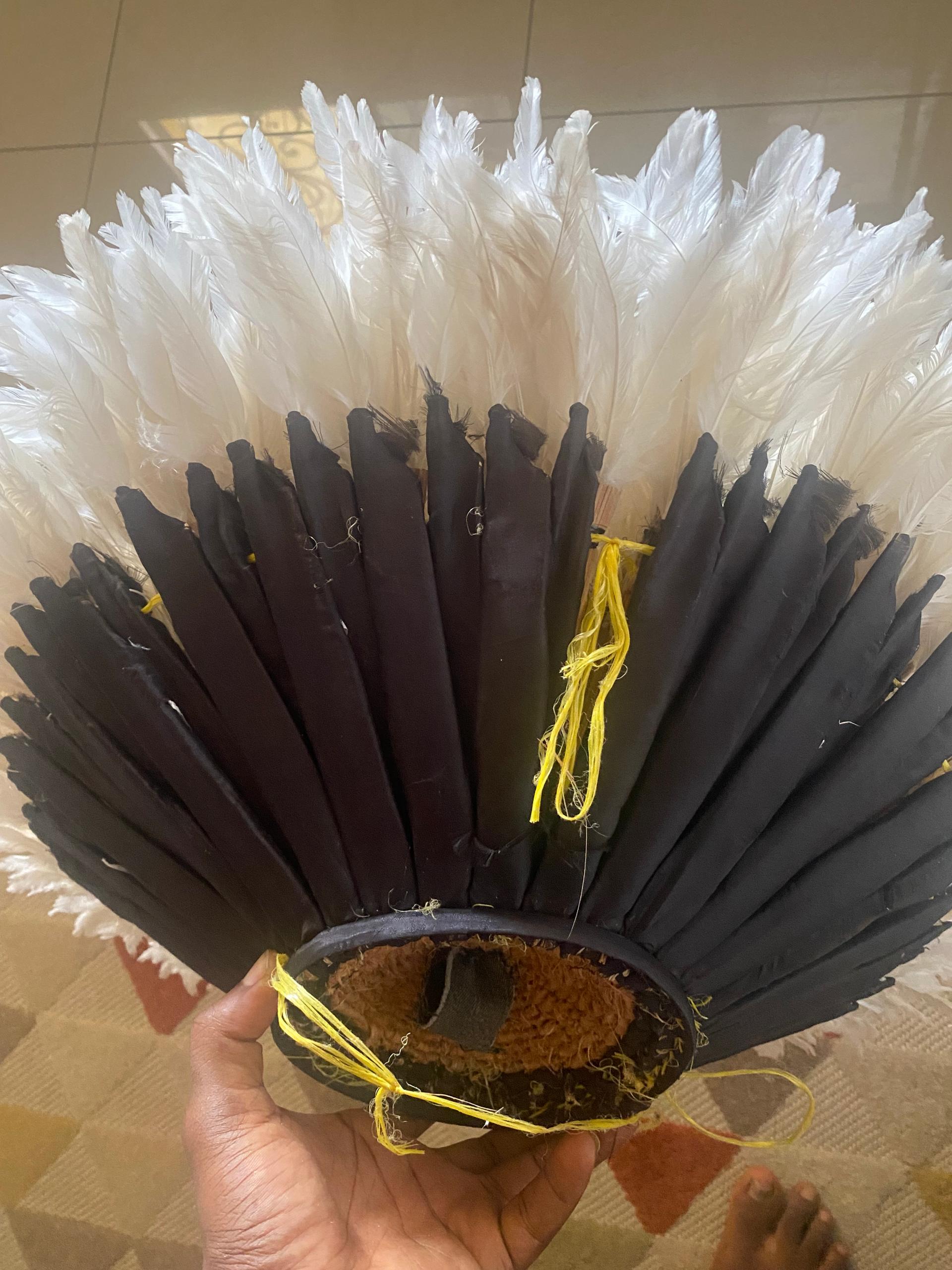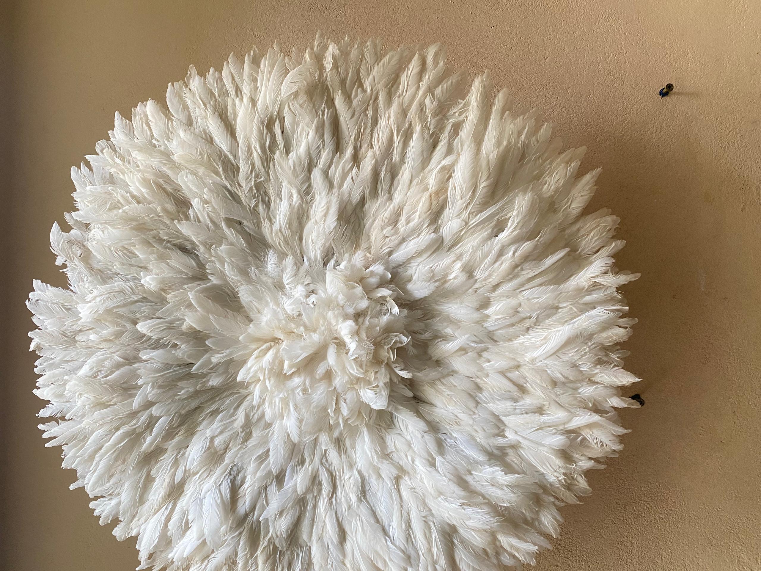 ✨ Fluffy White Feather Juju Hat Wall DecorTransform your space by Bringing elegance, culture, and texture into your home  – a true symbol of African artistry.