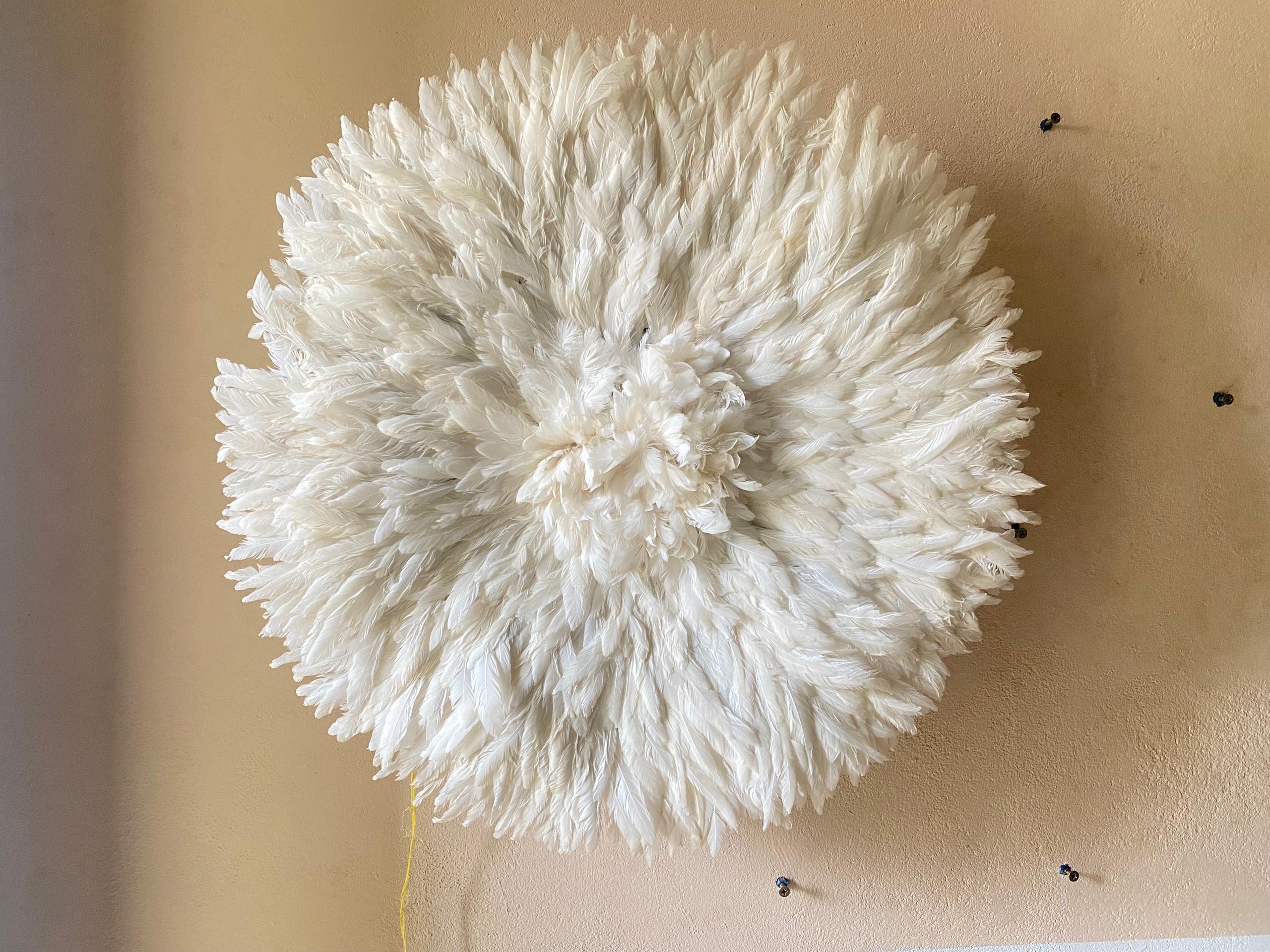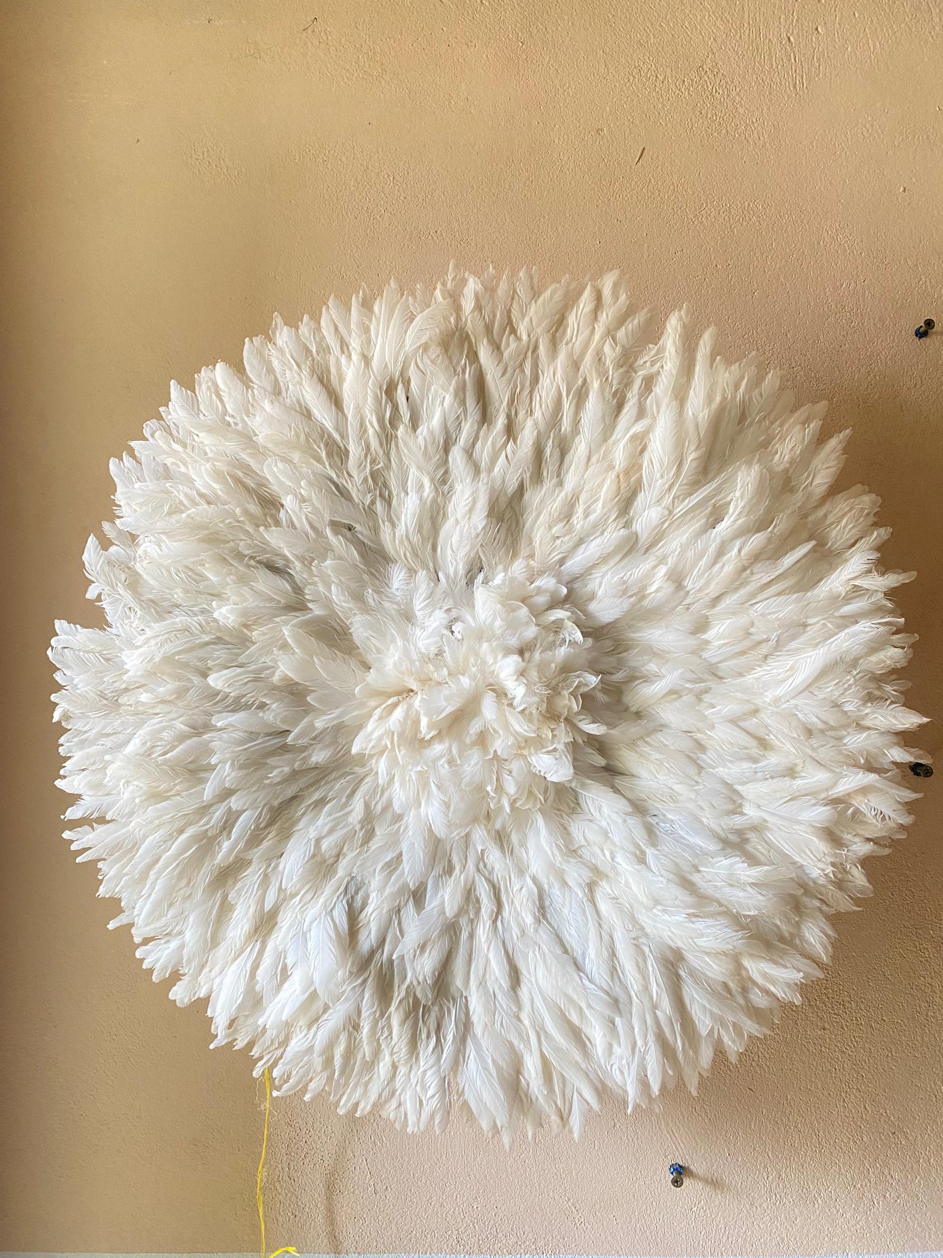 Fluffy White Feather Juju Hat wall decor handcrafted from premium feathers. Elegant, textured statement piece perfect for living rooms, bedrooms, and modern interiors.