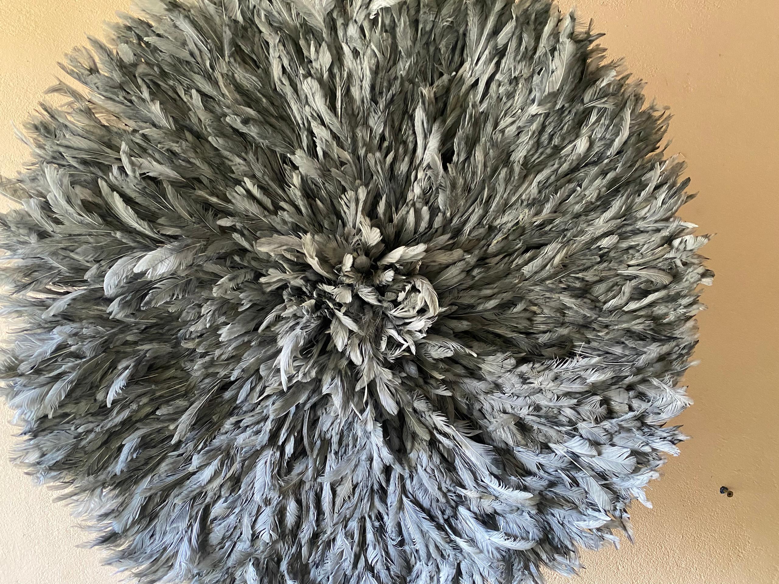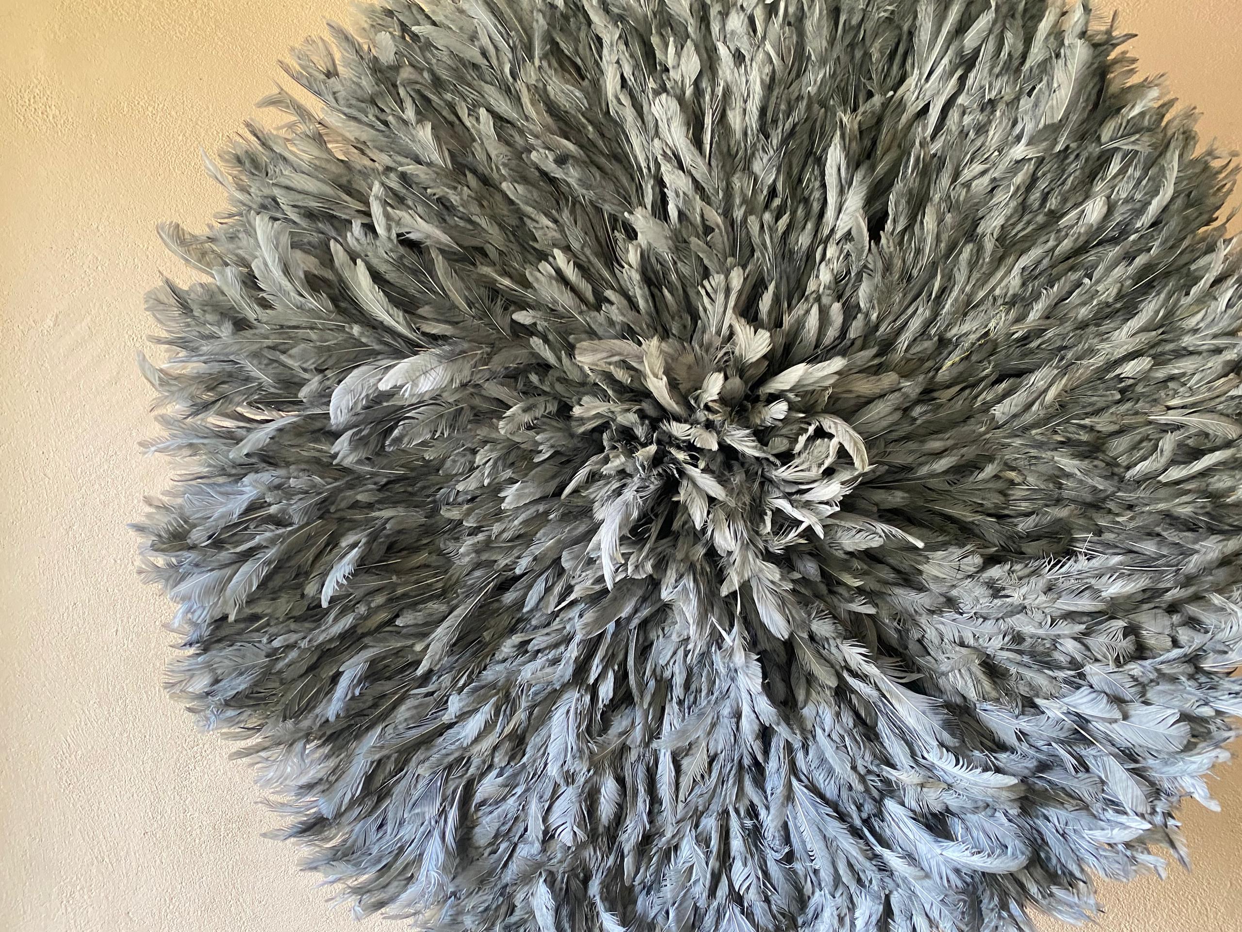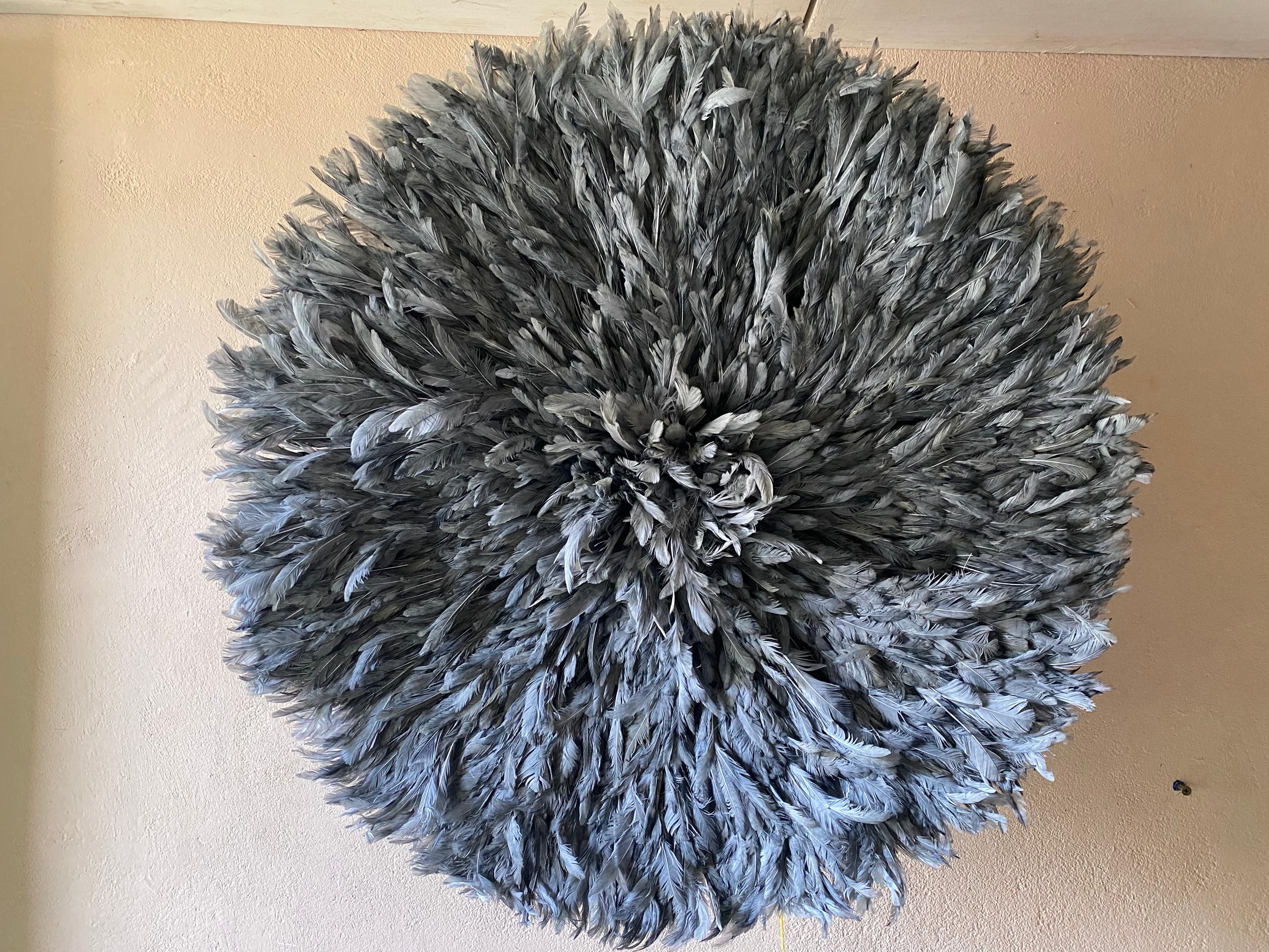At FortuneAfrik, we proudly create authentic, handcrafted Juju hats inspired by the traditional feather headdresses of the Bamileke tribe in Cameroon. This Gray Juju Hat is a stunning piece of wall decor that brings light, softness, and sophistication to any interior.