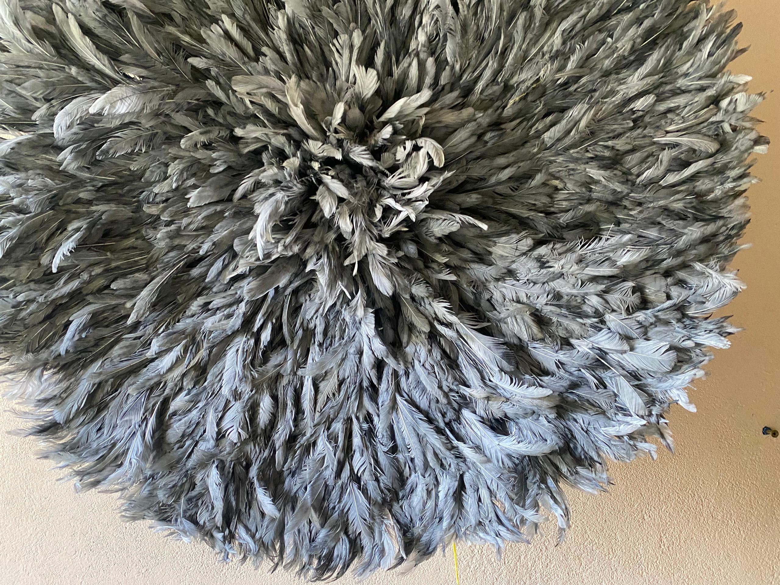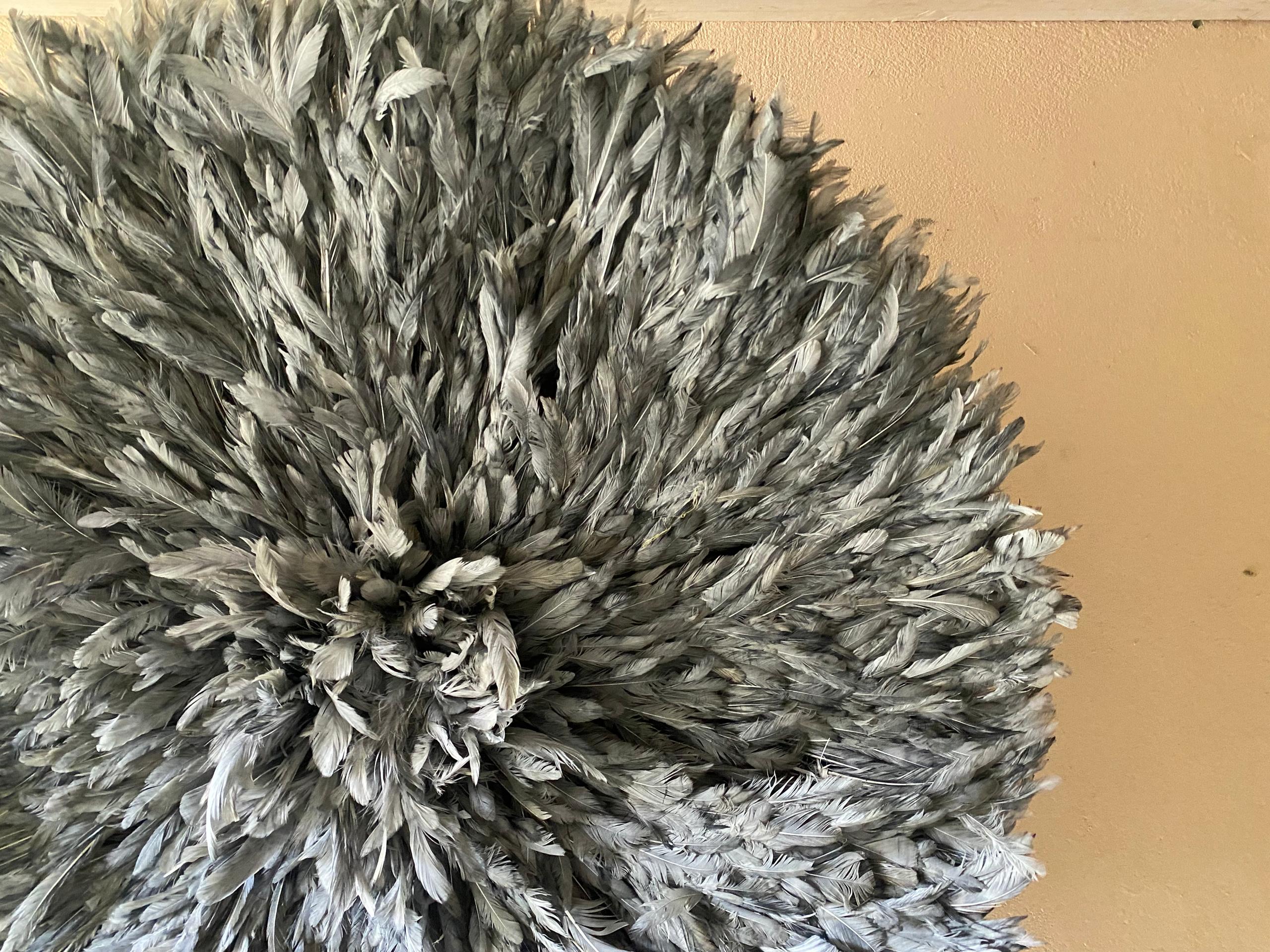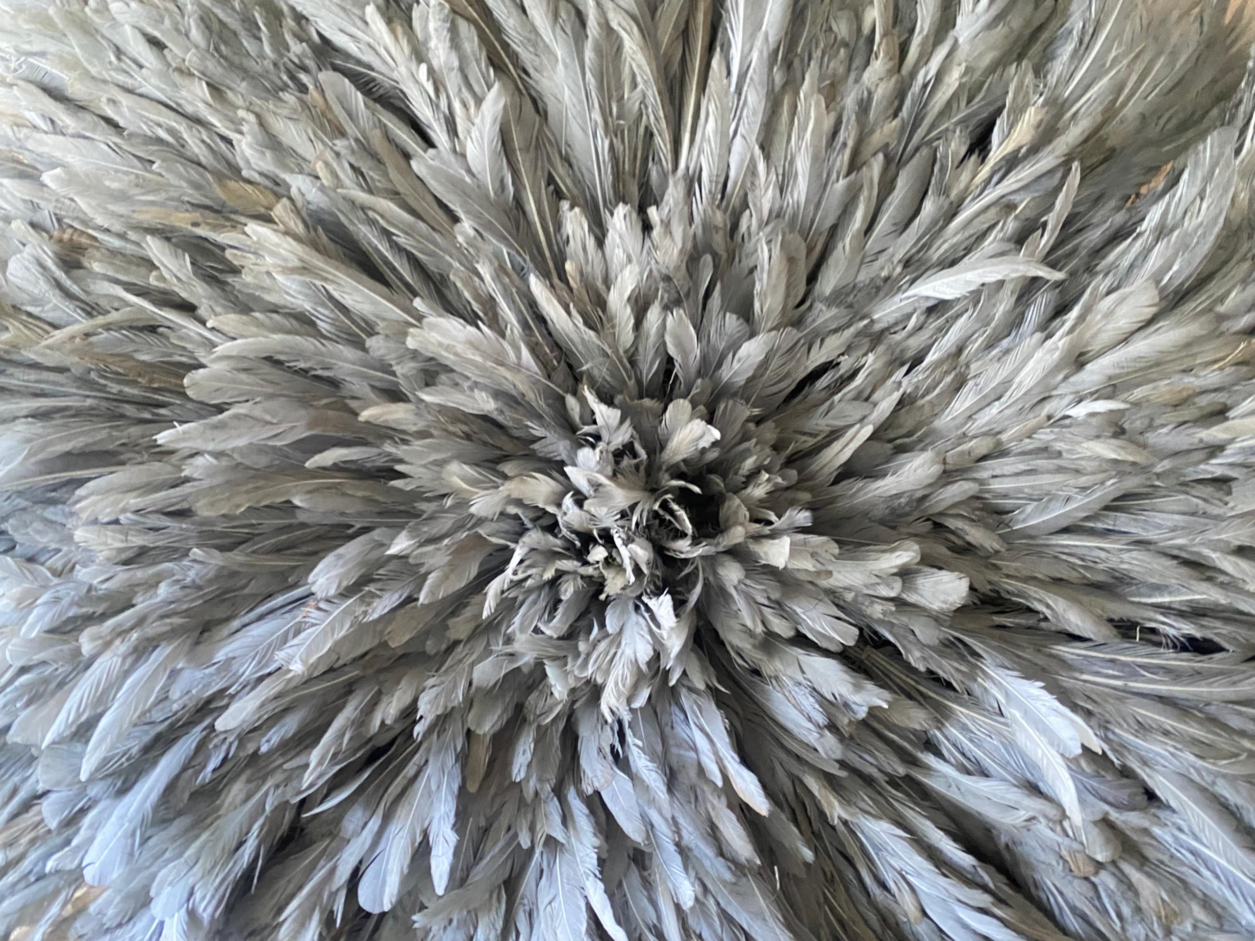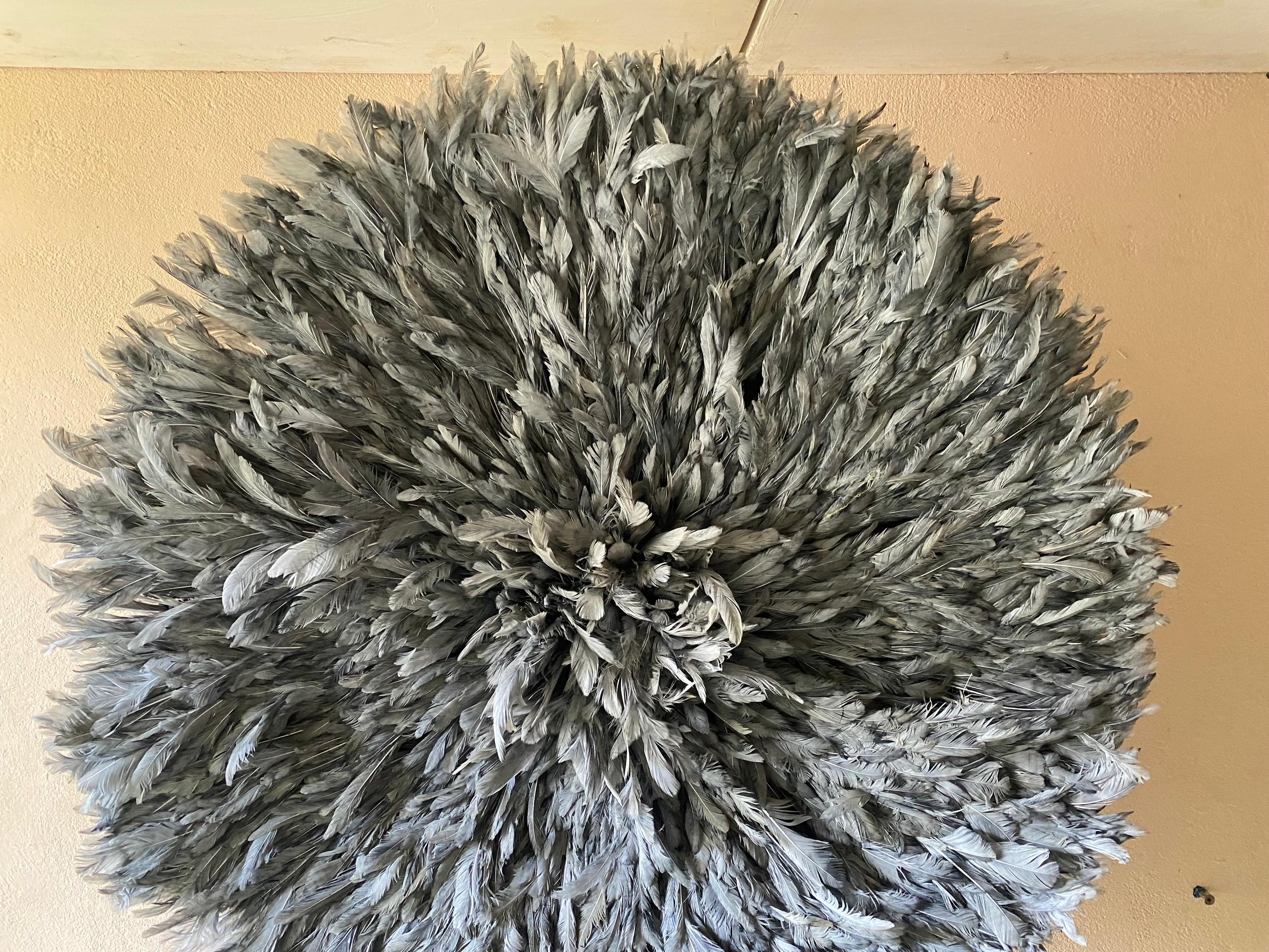 At FortuneAfrik, we proudly create authentic, handcrafted Juju hats inspired by the traditional feather headdresses of the Bamileke tribe in Cameroon. This Gray Juju Hat is a stunning piece of wall decor that brings light, softness, and sophistication to any interior.