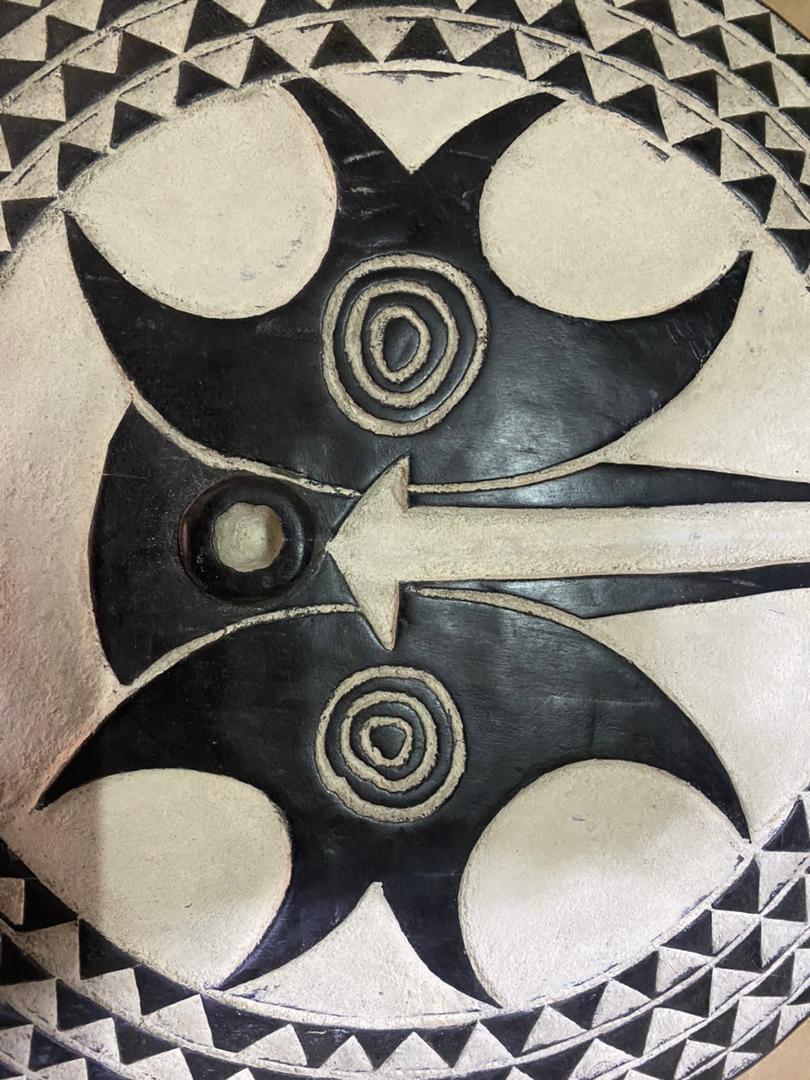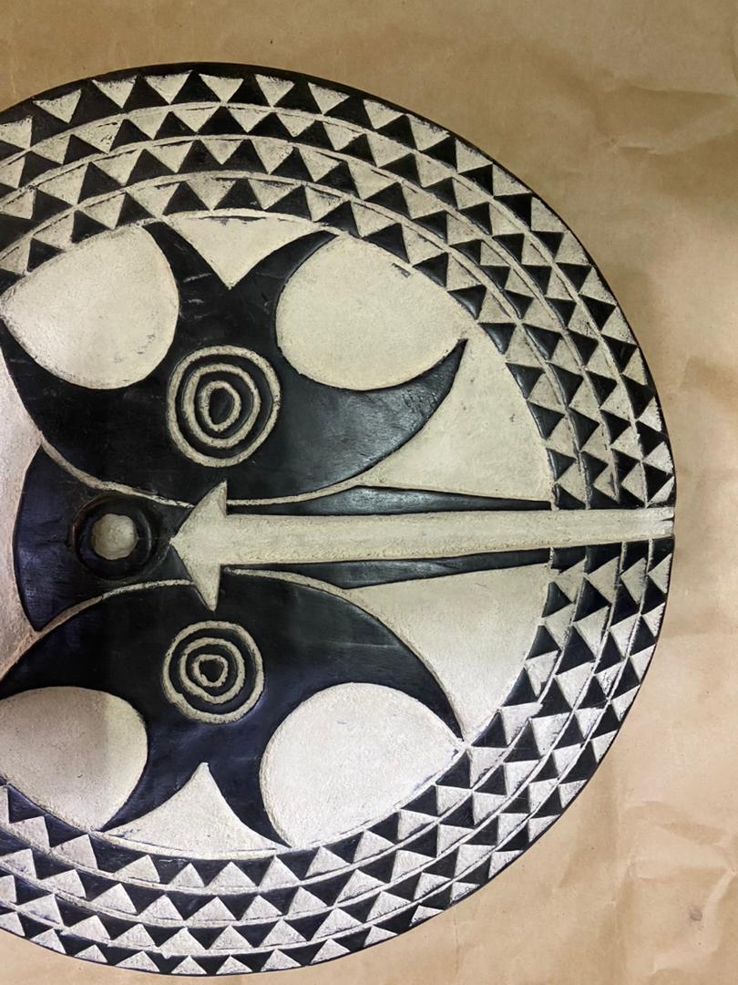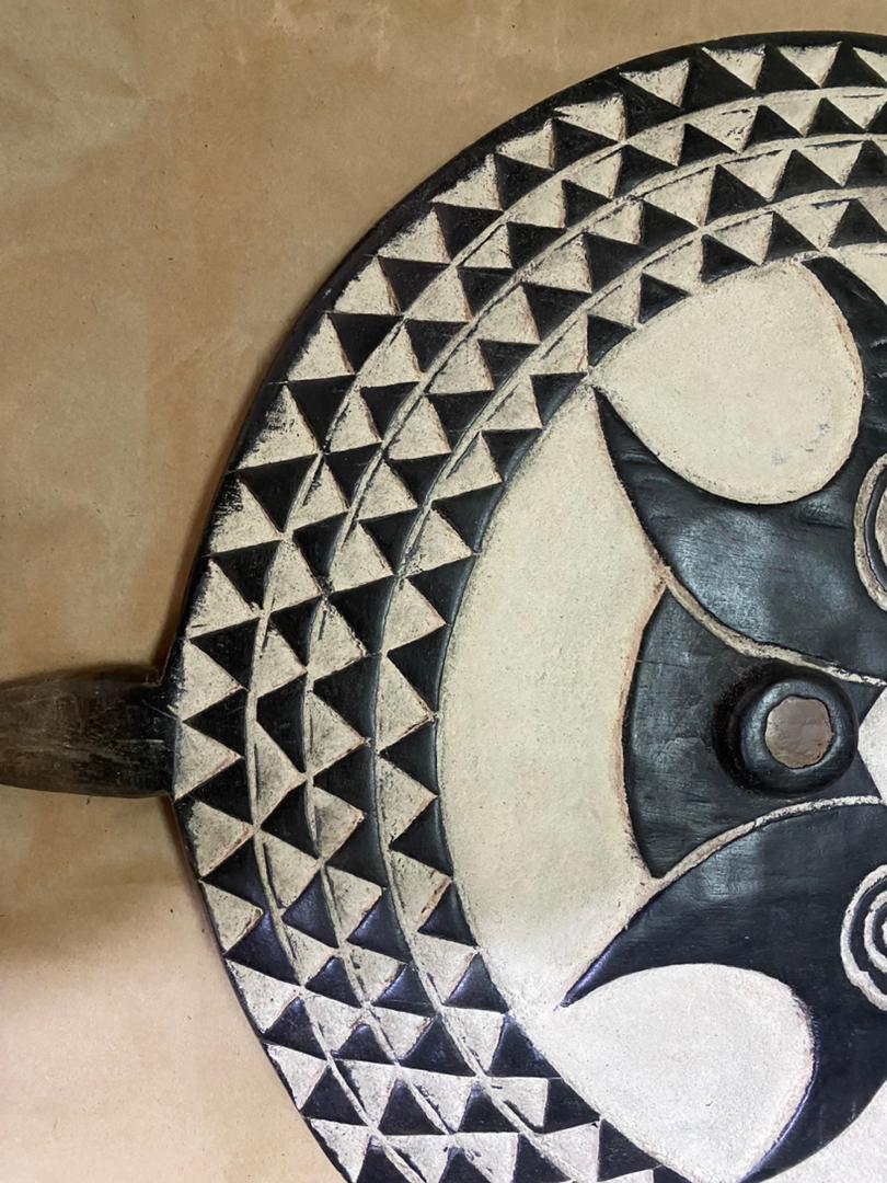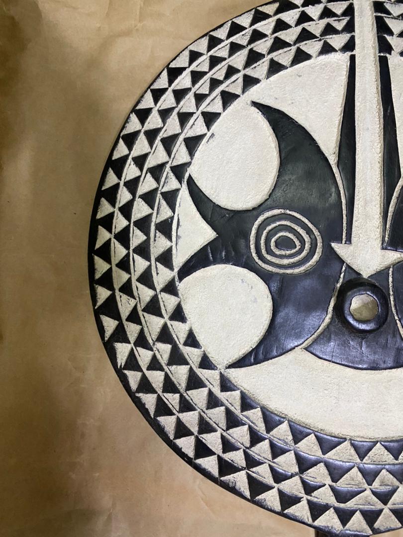 Handmade Bwa Sun Mask Wall Shield inspired by traditional African art. A unique statement wall decor piece for modern and luxury interiors.