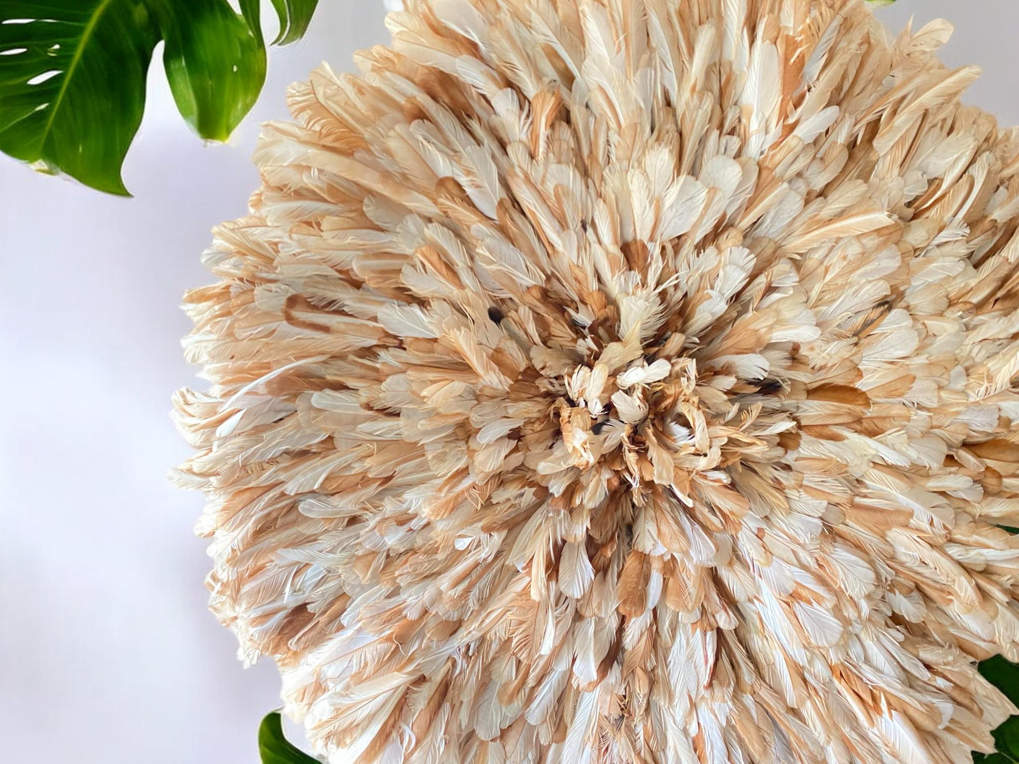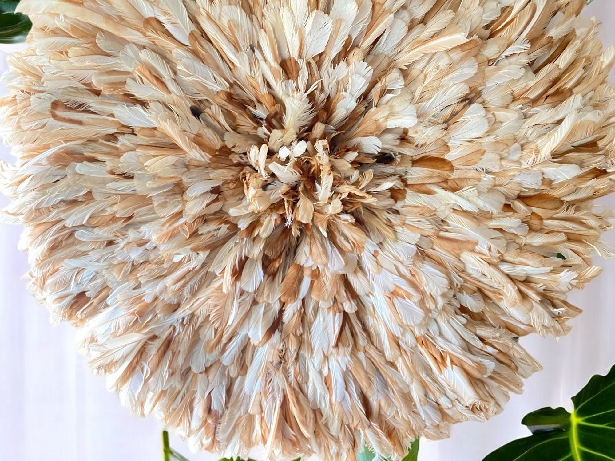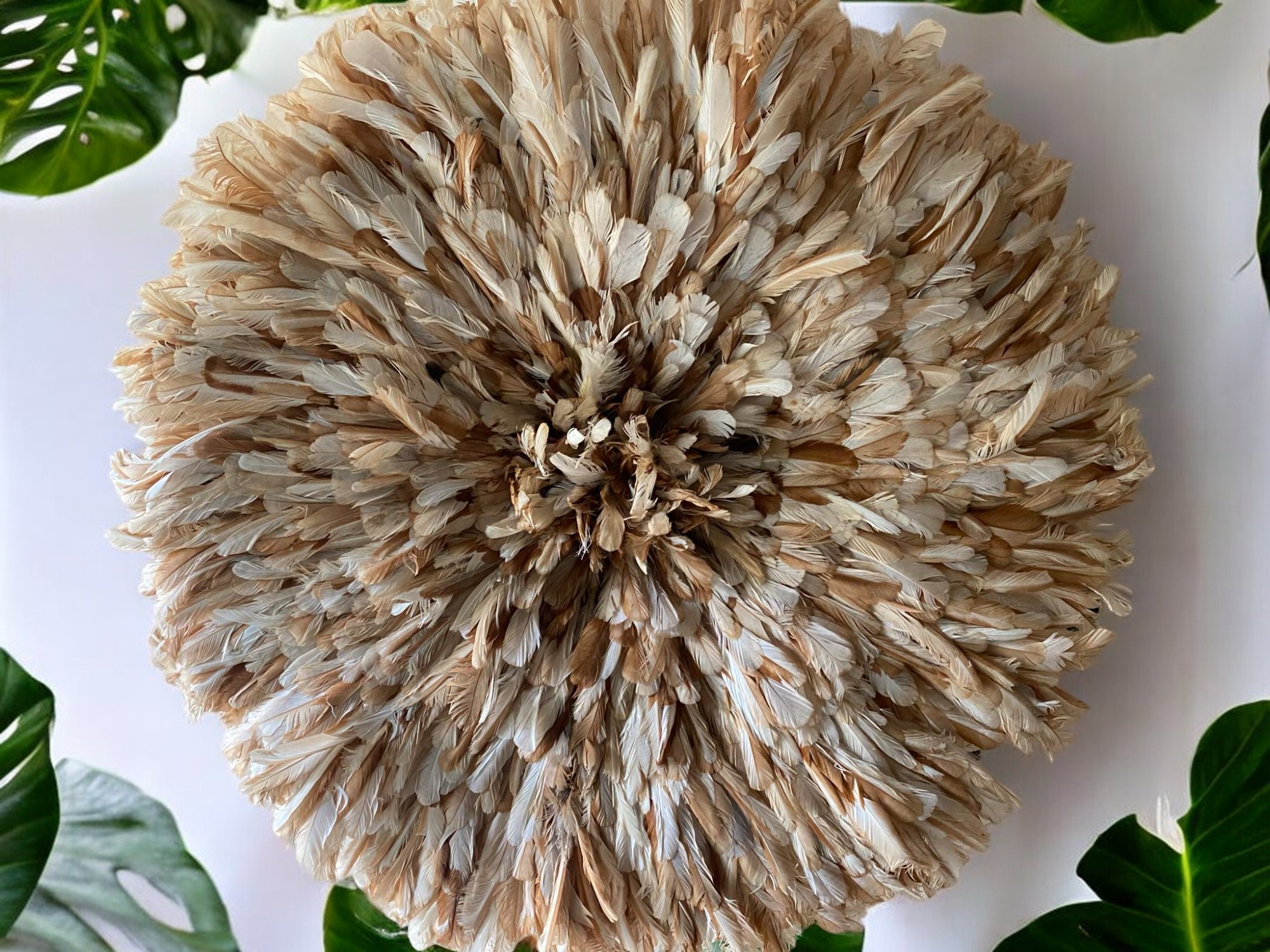 Premium Beige Juju Hat Wall Decor. Authentic tan African feather wall art for elegant living rooms, bedrooms, and entryway