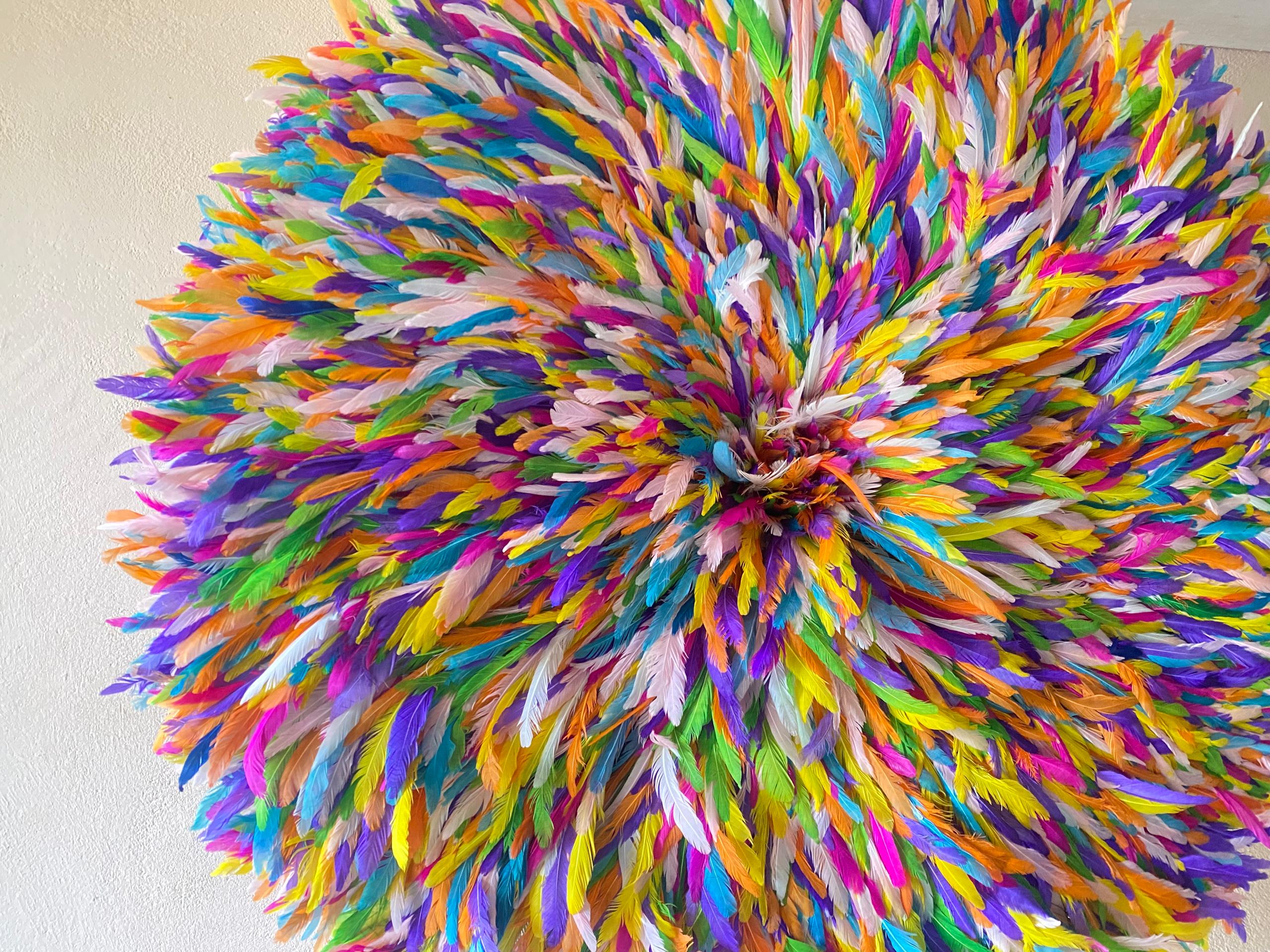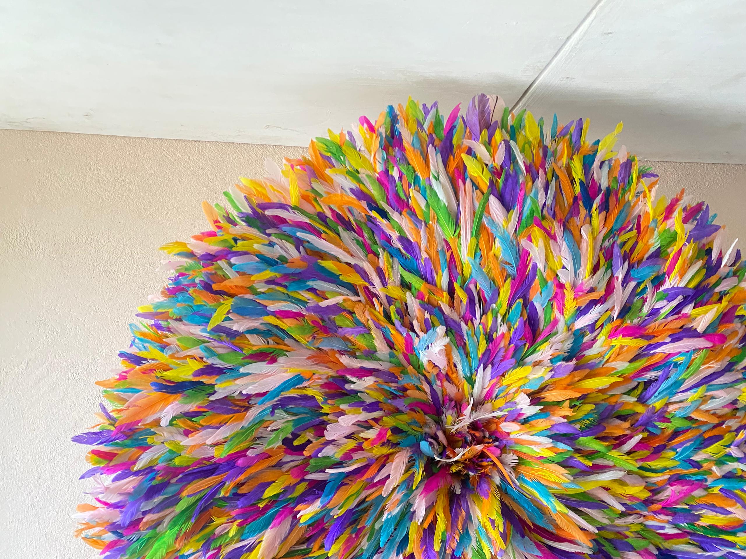 Shop Multicolor Juju Hat wall hanging – premium African feather art decor perfect for living rooms, bedrooms, and gallery walls.