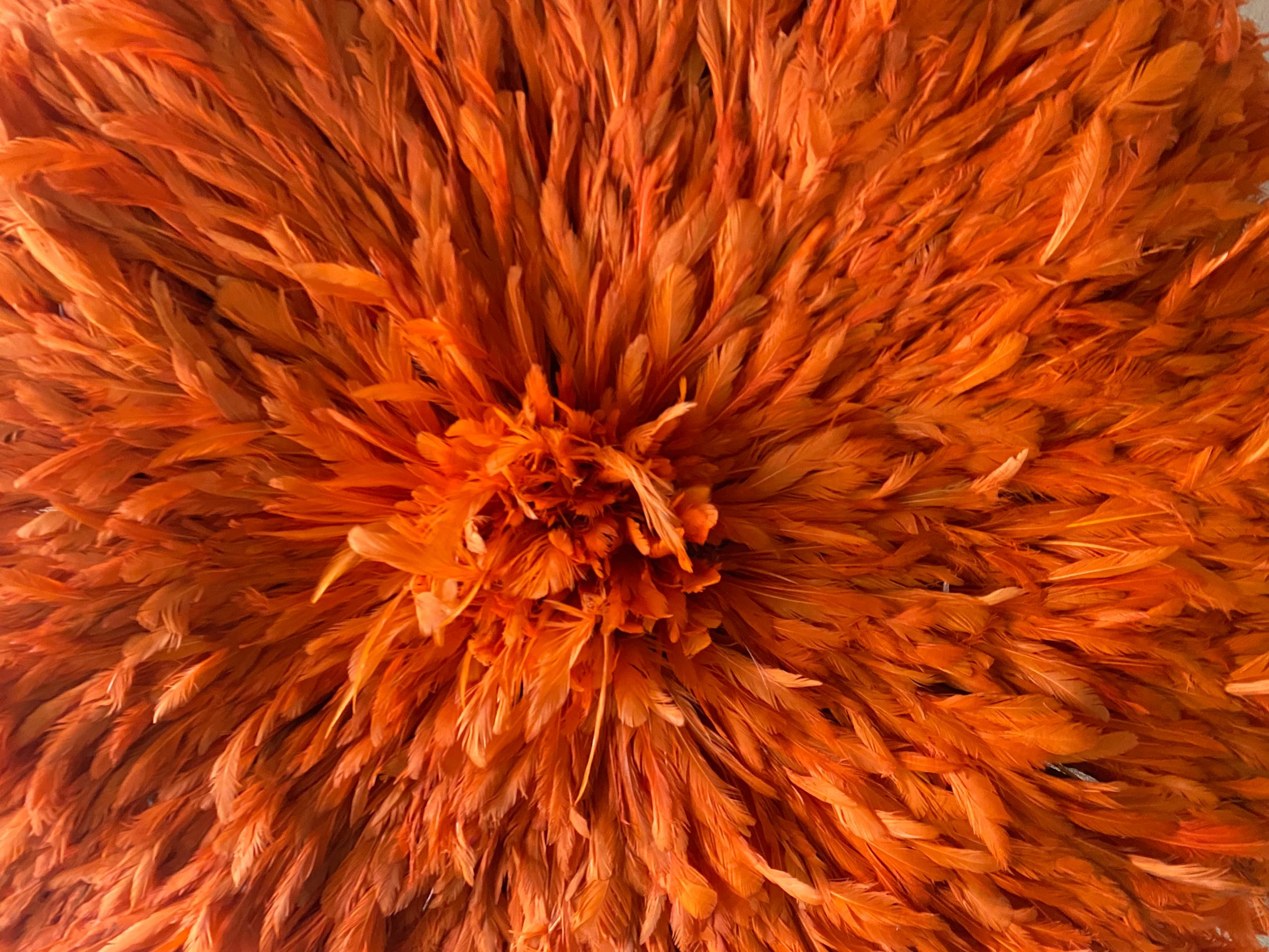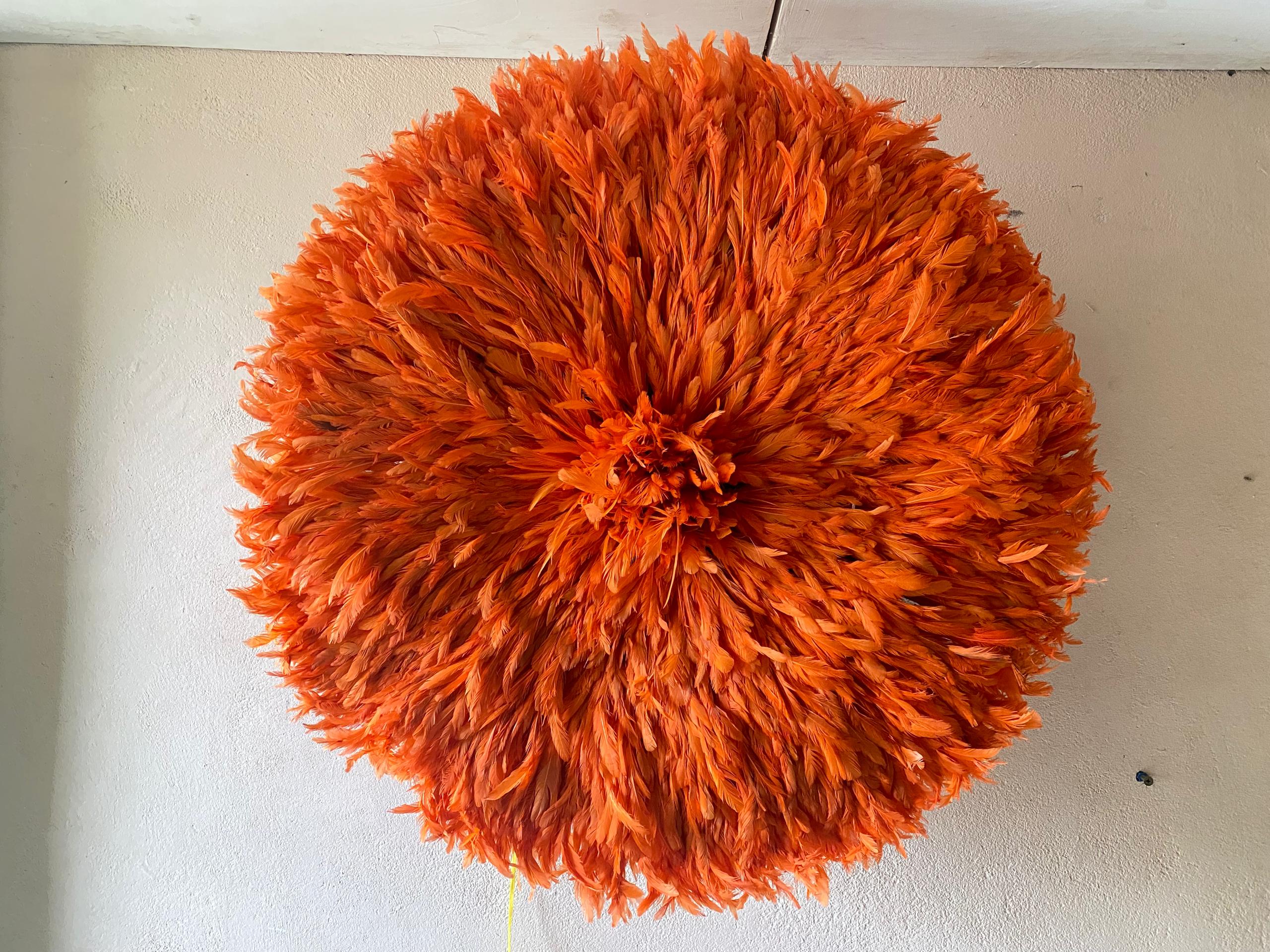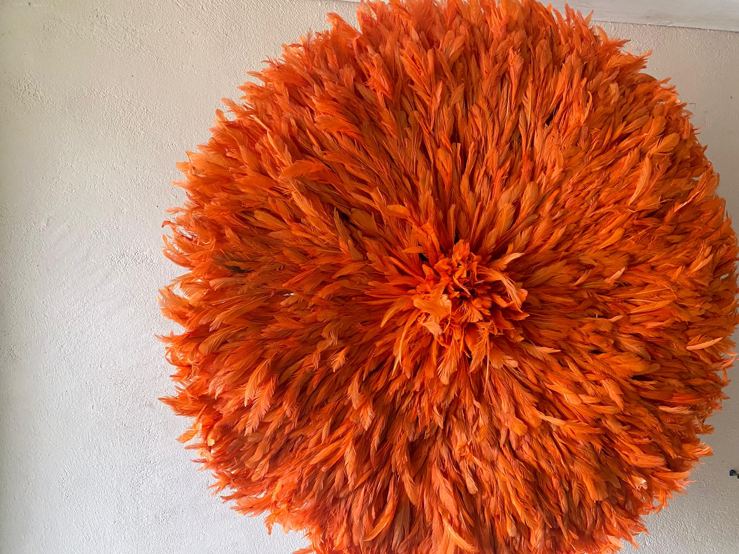 Each Orange Juju Hat is meticulously handcrafted by skilled artisans using carefully selected feathers arranged in layered precision. The result is a full, circular silhouette with soft texture and dimensional elegance. No two pieces are exactly alike—subtle variations make every wall décor uniquely yours.