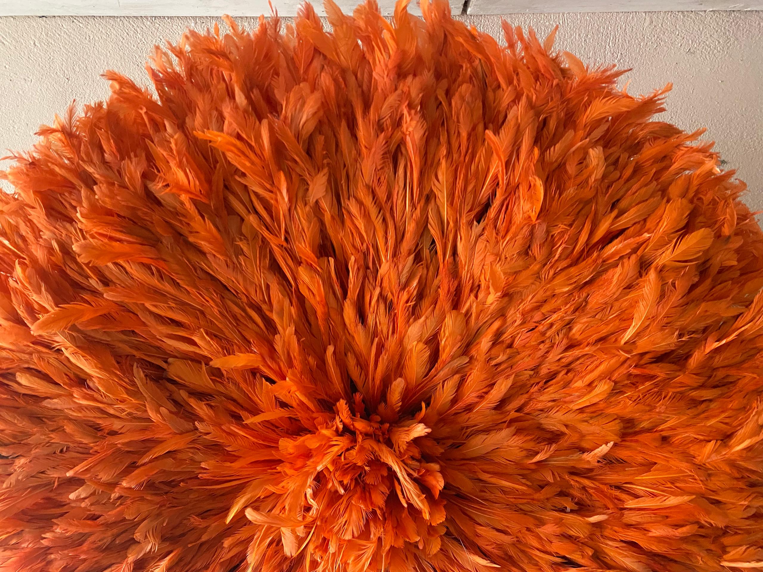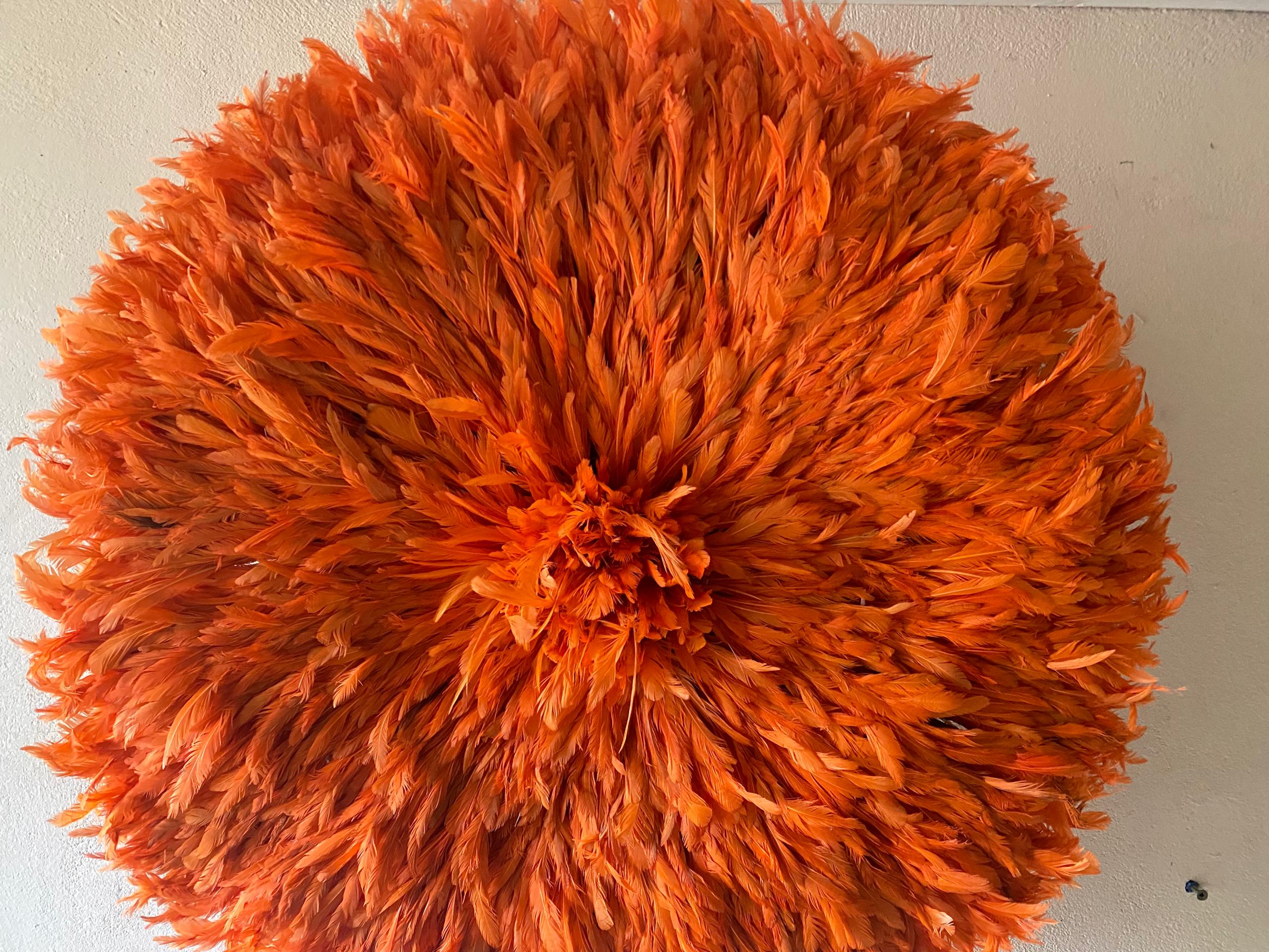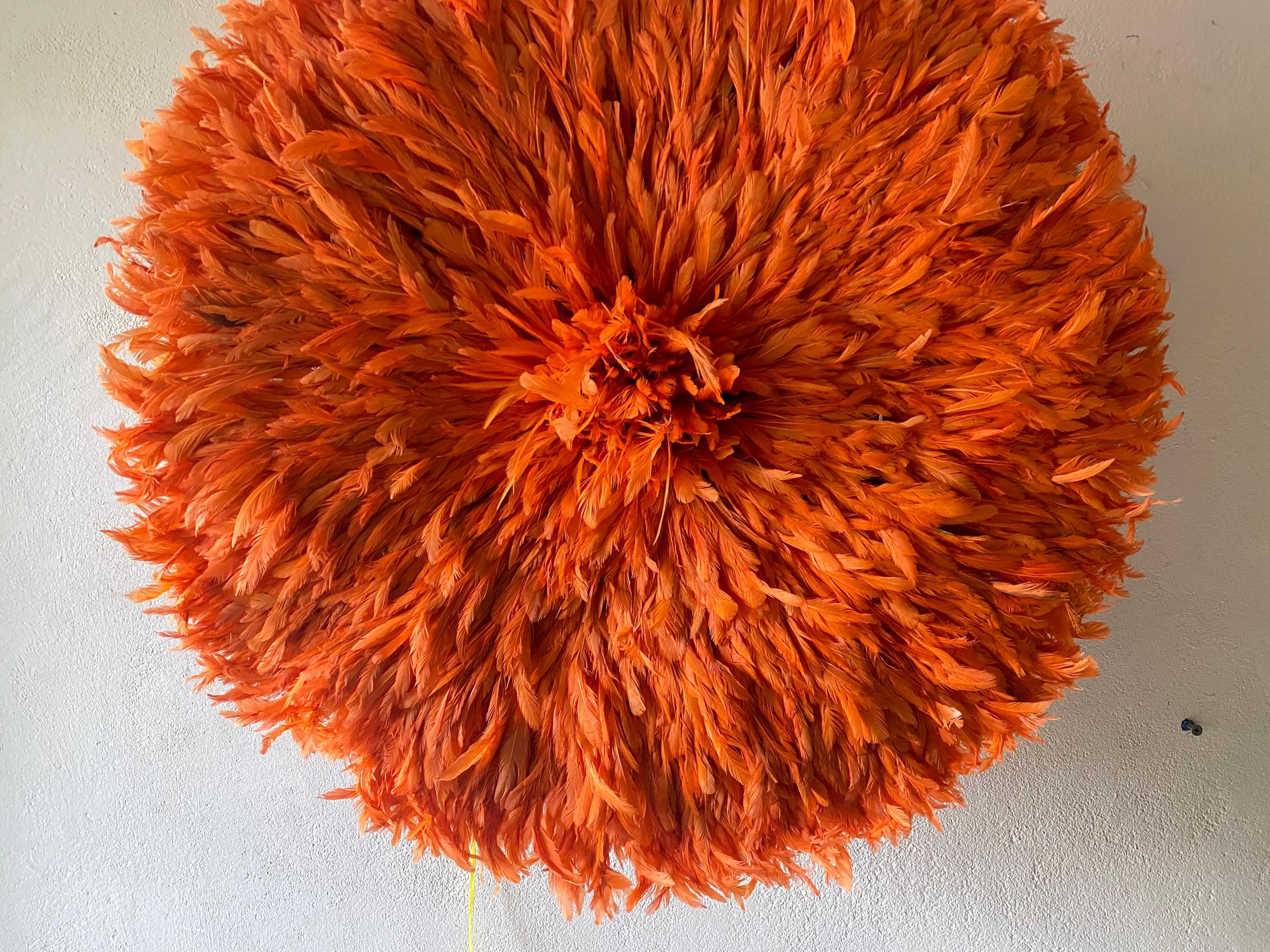 Each Orange Juju Hat is meticulously handcrafted by skilled artisans using carefully selected feathers arranged in layered precision. The result is a full, circular silhouette with soft texture and dimensional elegance. No two pieces are exactly alike—subtle variations make every wall décor uniquely yours.