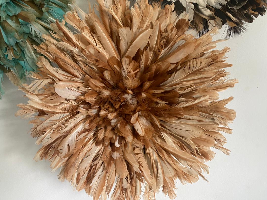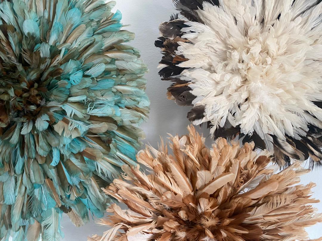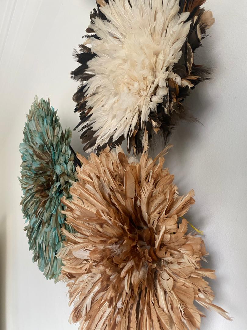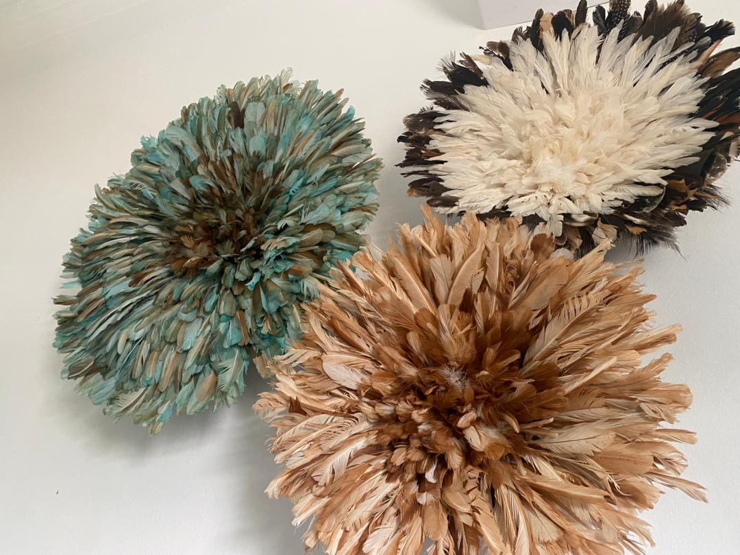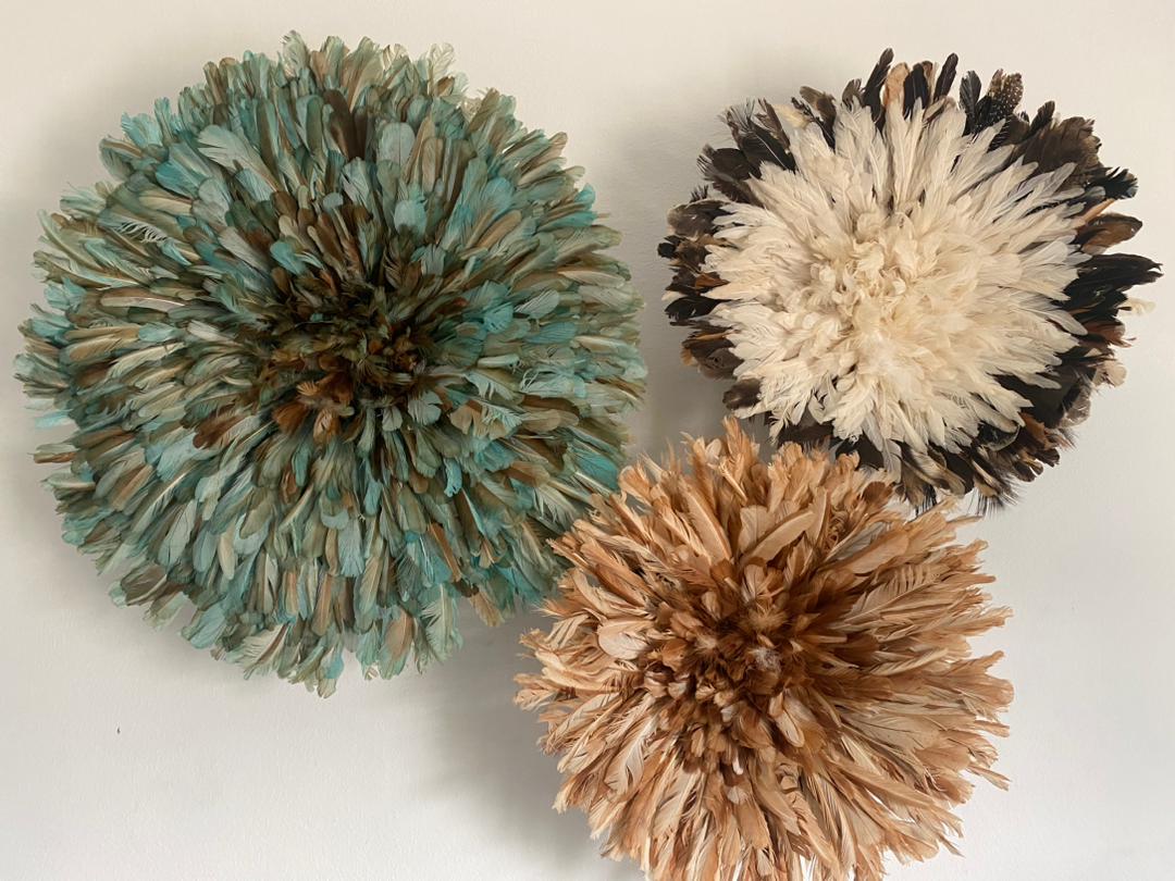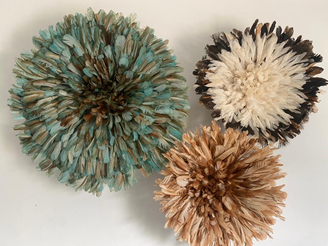 Elevate your home décor with our stunning Juju Hat Trio Set featuring Petrol Green, Tan, and White feather designs. Handcrafted with care, these exquisite wall accents bring a touch of elegance, texture, and cultural charm to any space. Perfect for living rooms, bedrooms, or entryways, each piece adds depth and sophistication while creating a warm, inviting atmosphere.