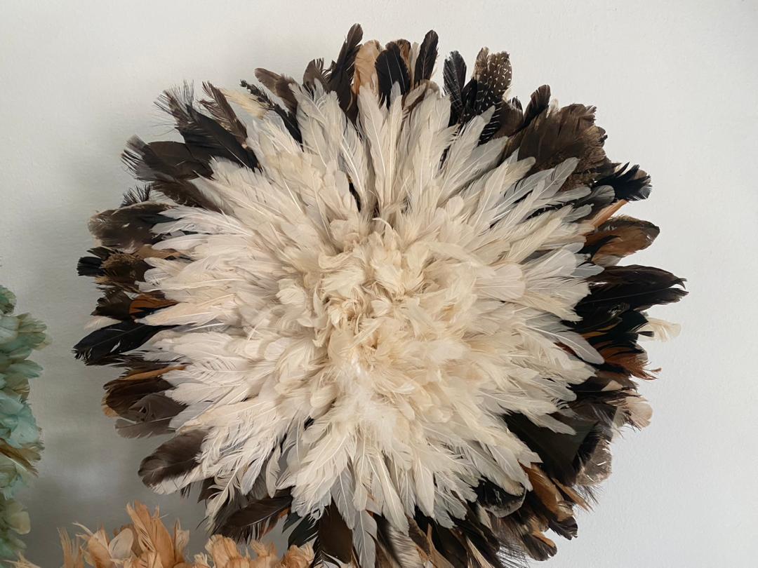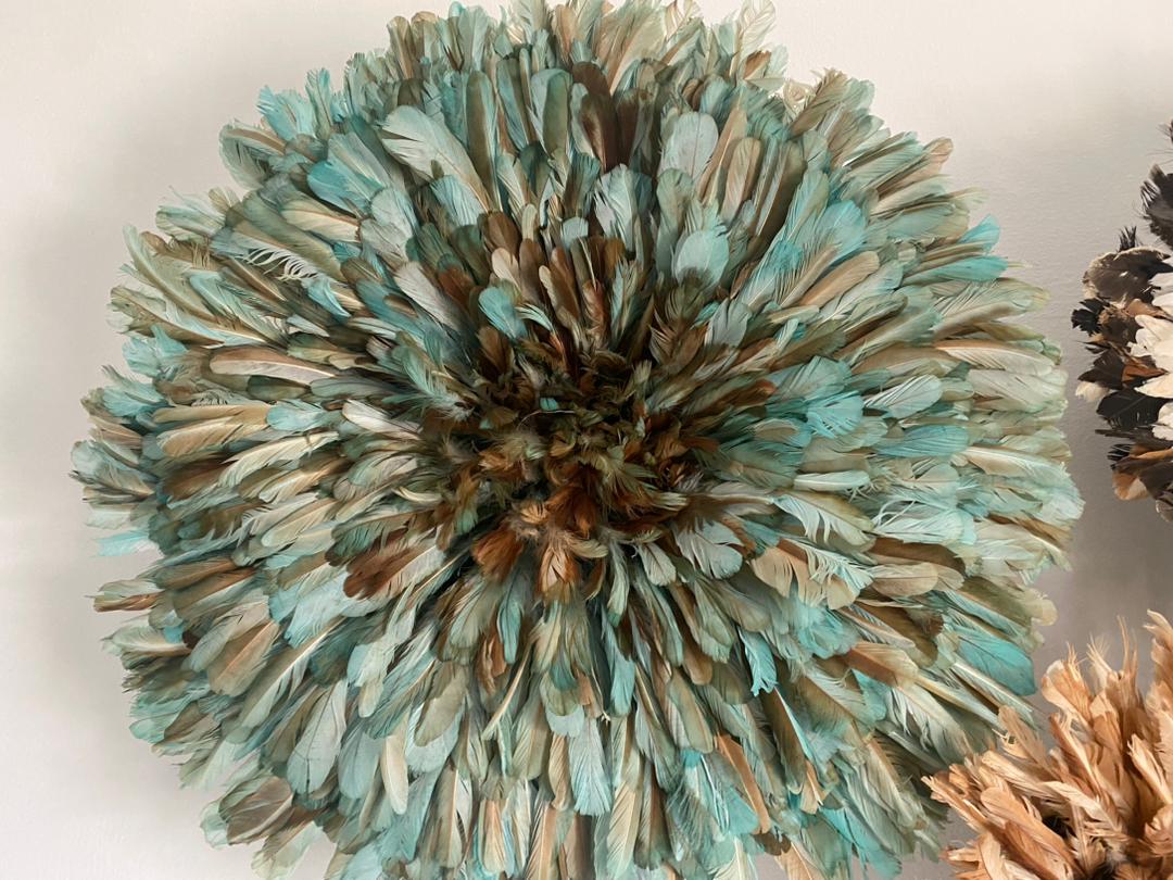 Crafted from high-quality feathers, the Petrol Green, Tan, and White Juju Hats showcase a harmonious blend of natural tones and vibrant colors, making them versatile for both modern and bohemian interiors. Their lightweight construction ensures easy mounting, while the intricate design reflects artisanal craftsmanship inspired by traditional Cameroonian heritage.