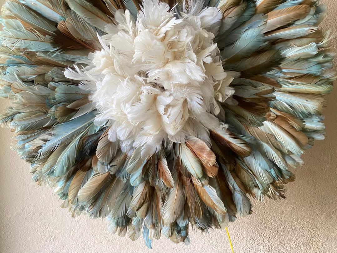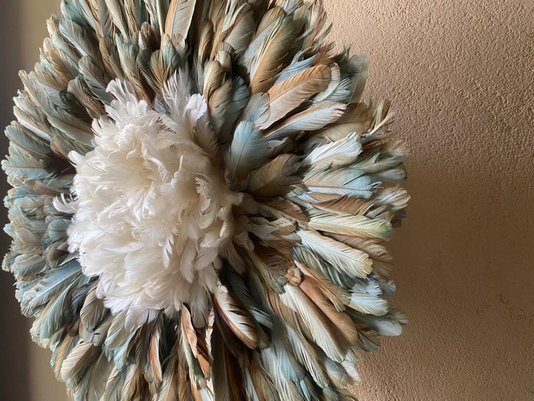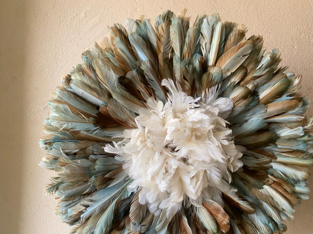 Elevate your home décor with our Tan Green Juju Hat featuring a White Feather Center, a stunning blend of natural tones and artistic craftsmanship. Handmade with care, this wall accent combines soft tan and green feathers with a striking white center, creating a dynamic, textured focal point for any room.