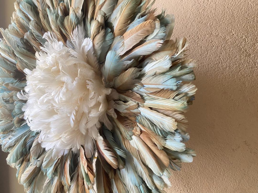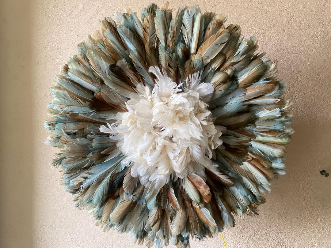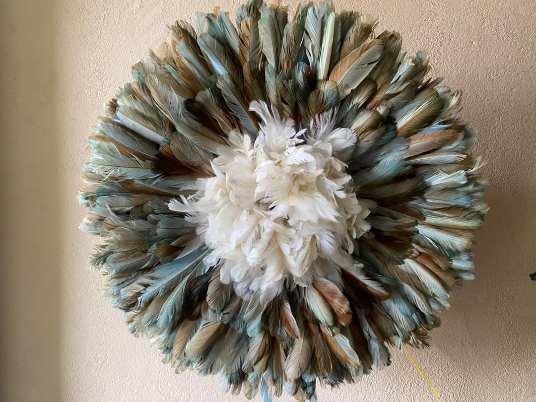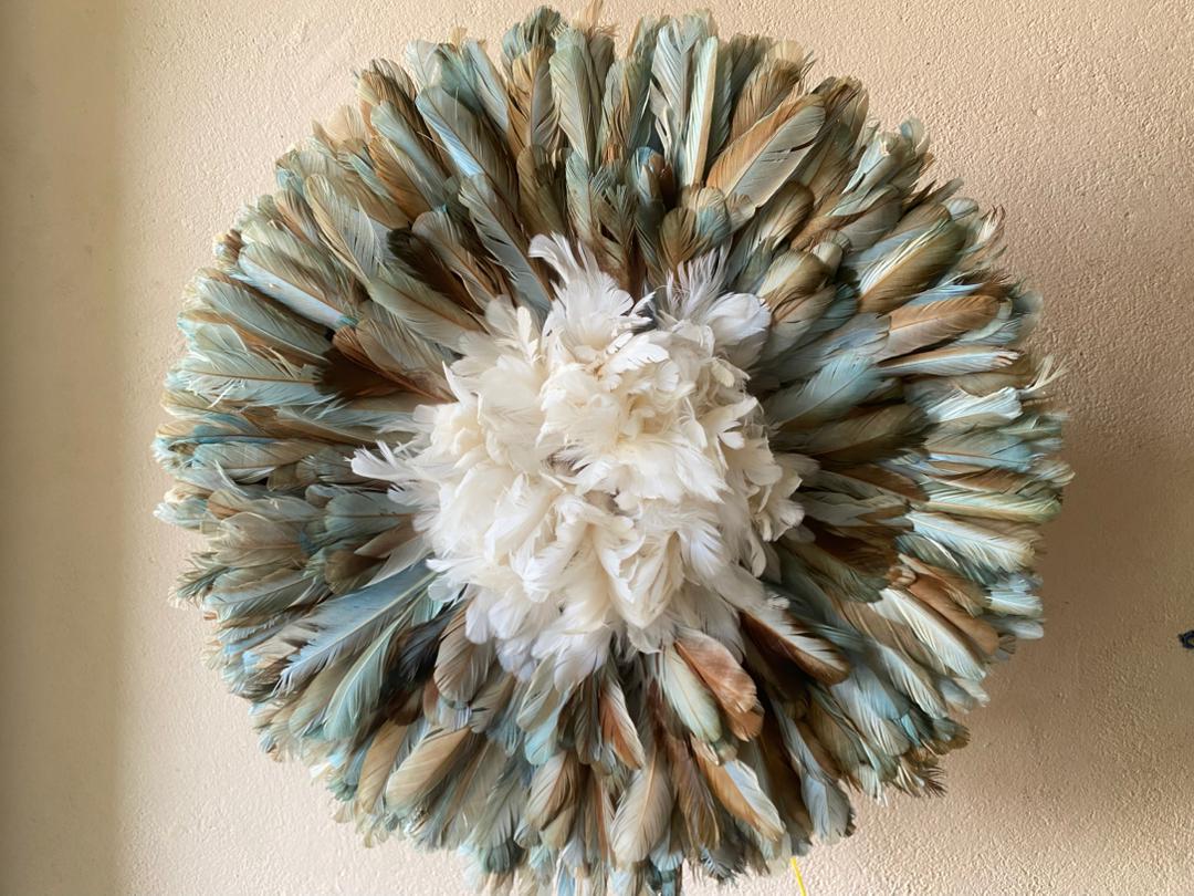 “Add a touch of elegance and texture to your walls with our Tan Green Juju Hat, featuring a stunning white feather center. Handcrafted with care, this unique wall décor piece brings warmth, culture, and sophistication to any space.”