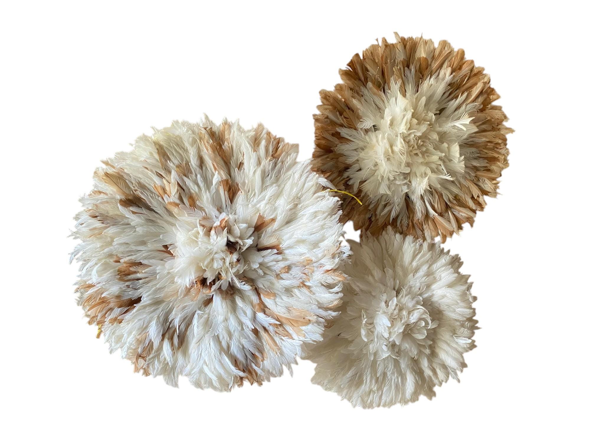 Elevate your interior with our White and beige juju hat Trio set – Feather Wall Hanging — a sophisticated wall décor collection that blends African heritage with modern elegance. Handcrafted by skilled artisans in Cameroon, each Juju hat is meticulously assembled using natural feathers, creating a luxurious layered texture that instantly transforms any space.