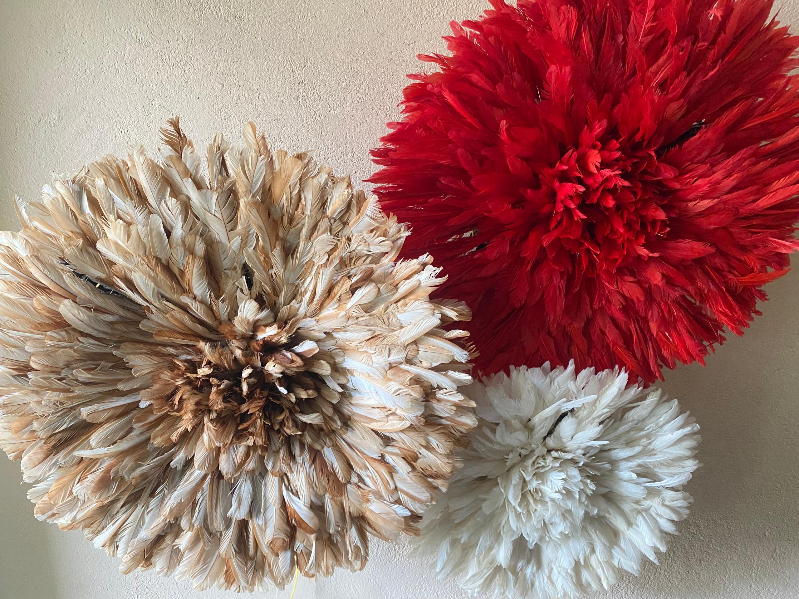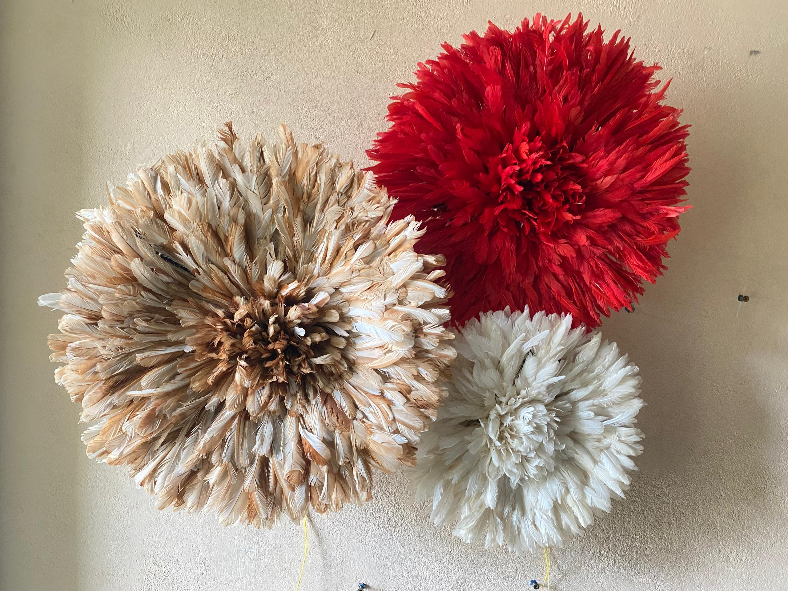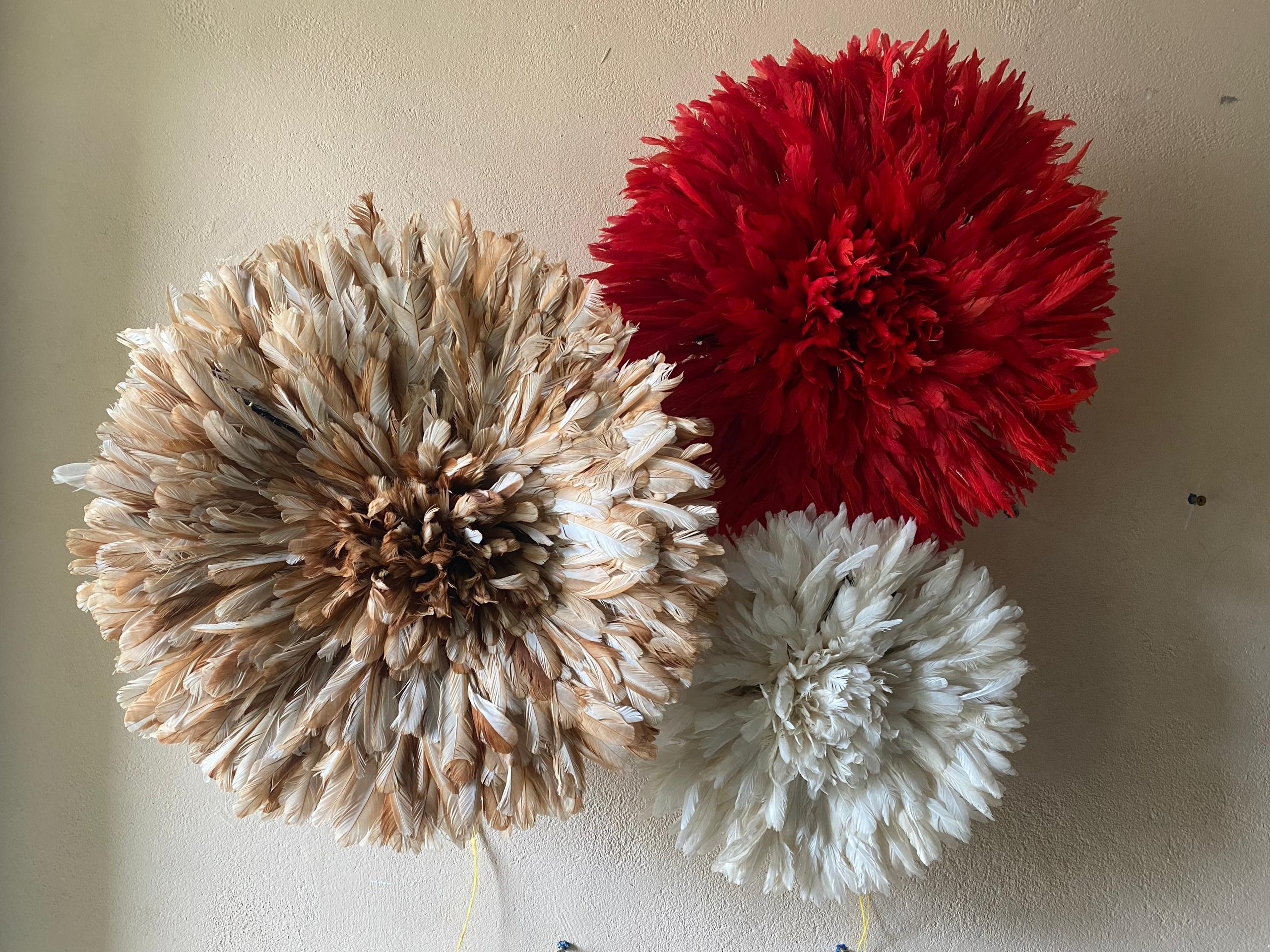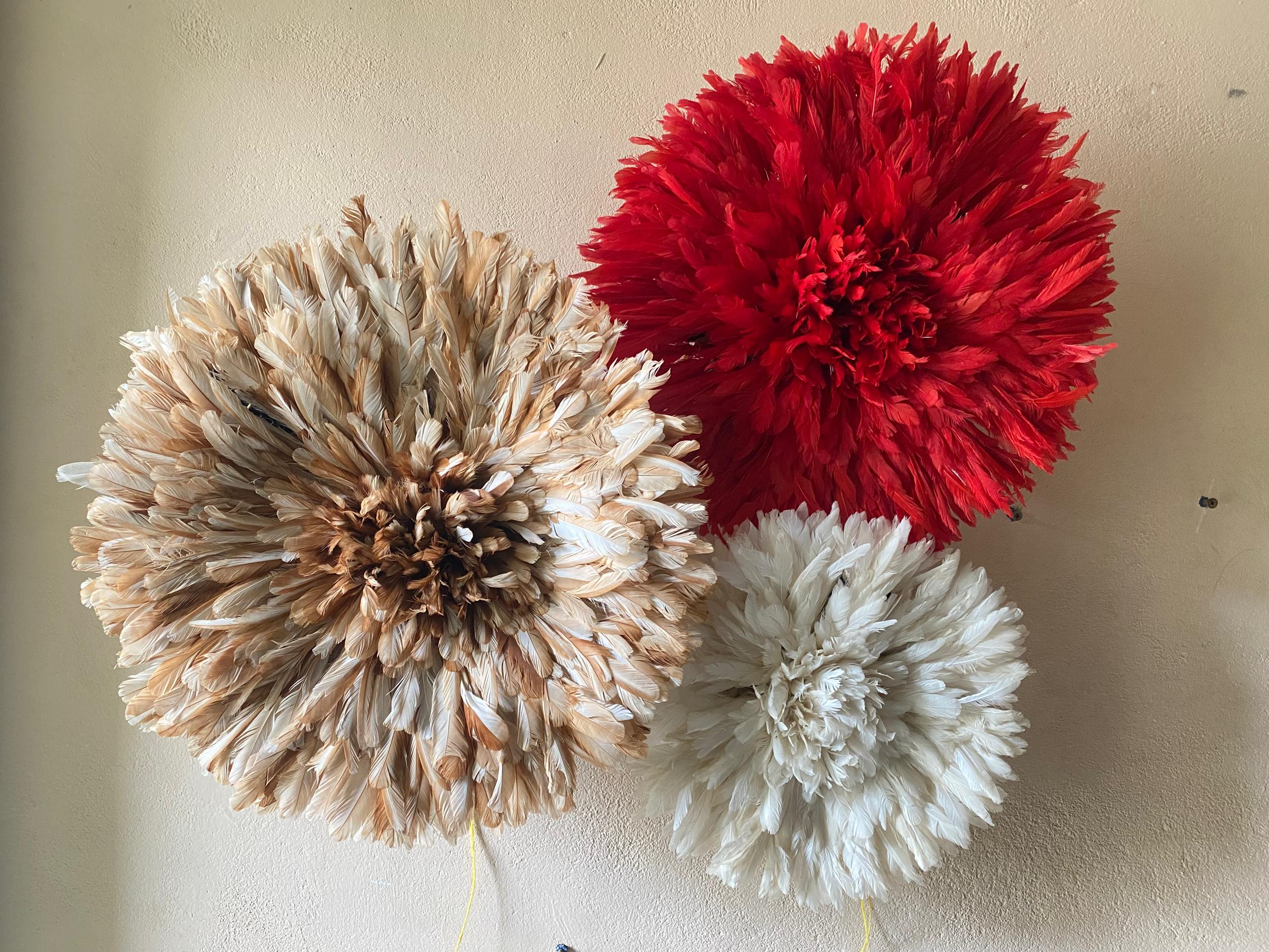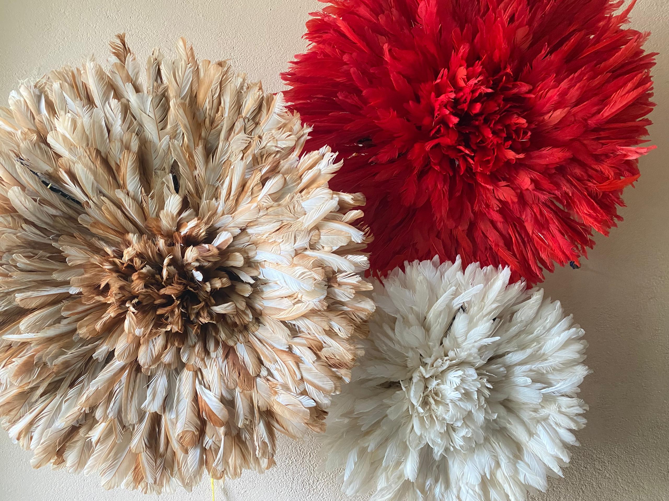 Elevate your space with a Trio Juju Hat Set in red, beige and white. Handmade African feather wall decor for stylish, statement interiors.