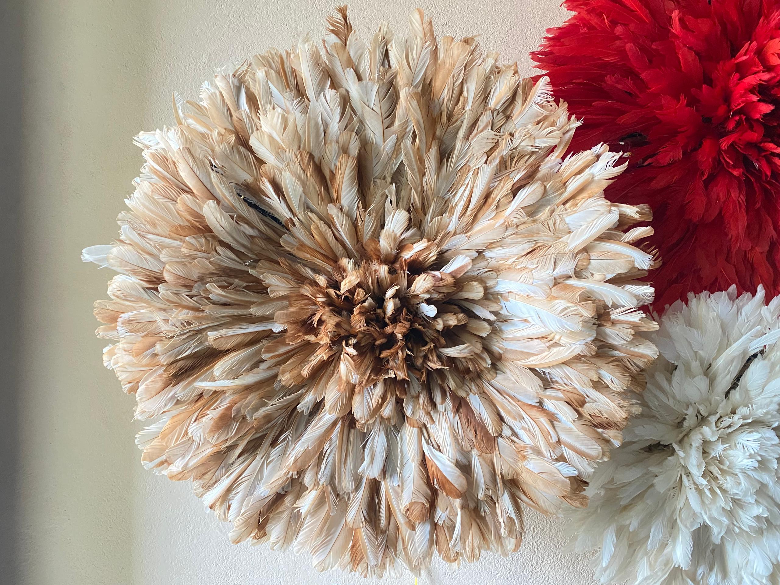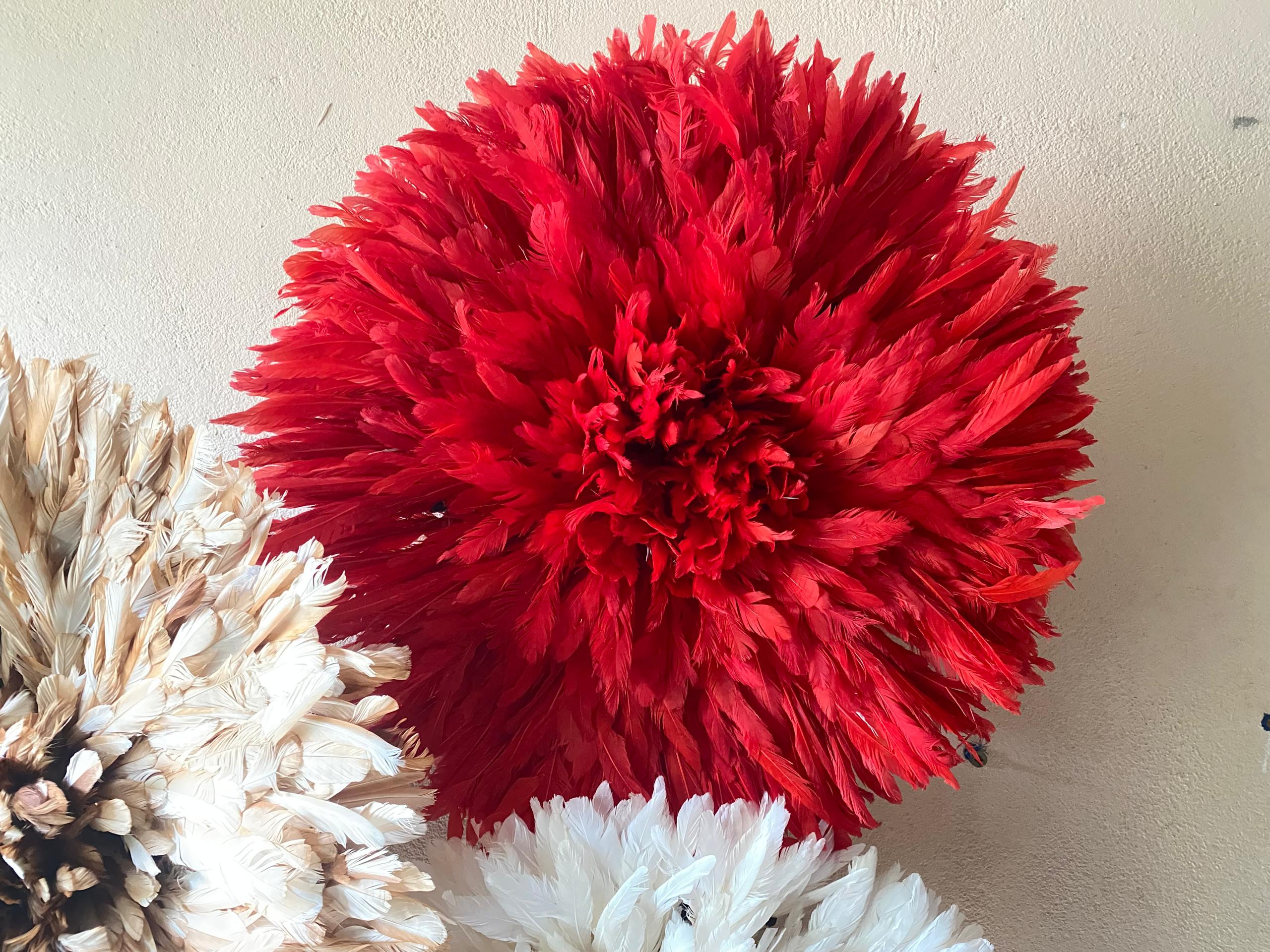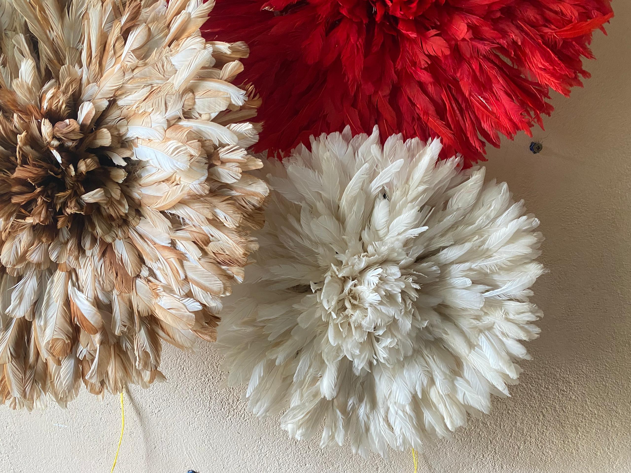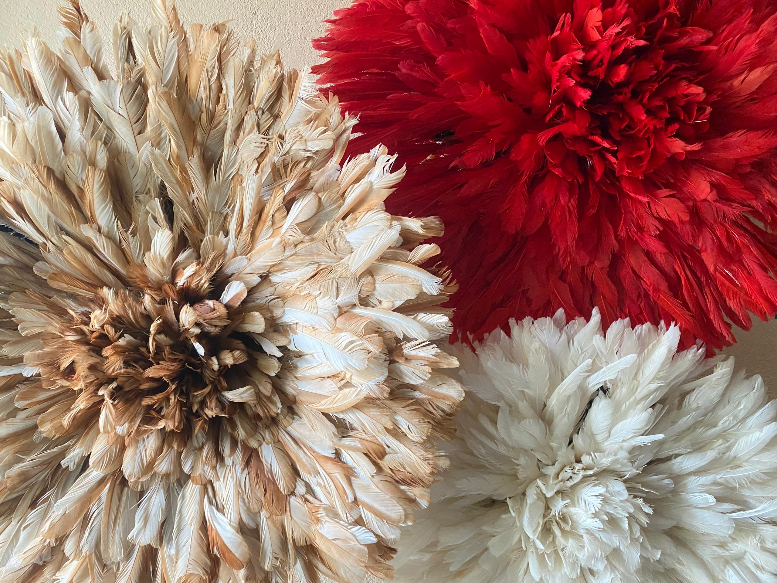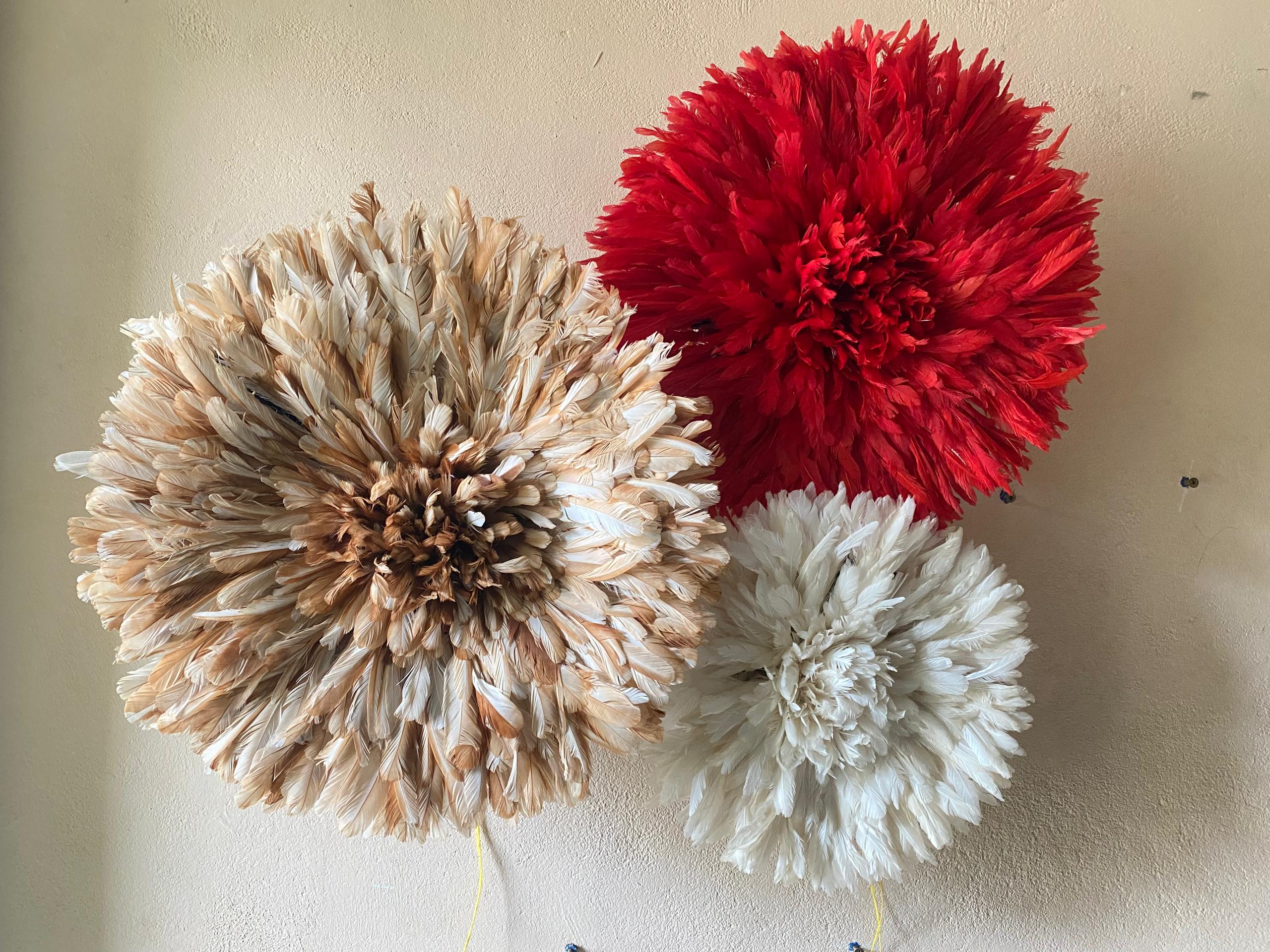 Elevate your space with a Trio Juju Hat Set in red, beige and white. Handmade African feather wall decor for stylish, statement interiors.