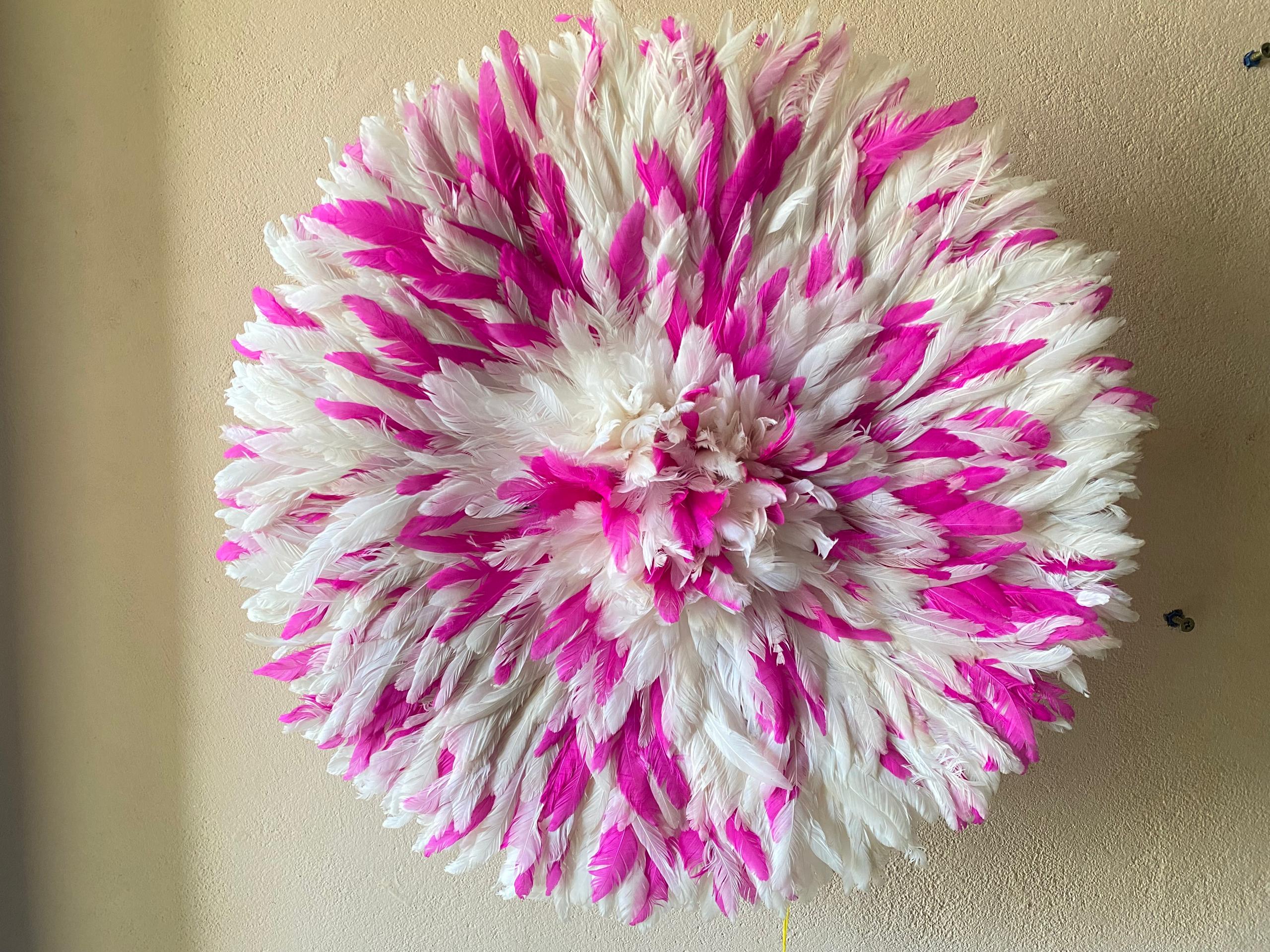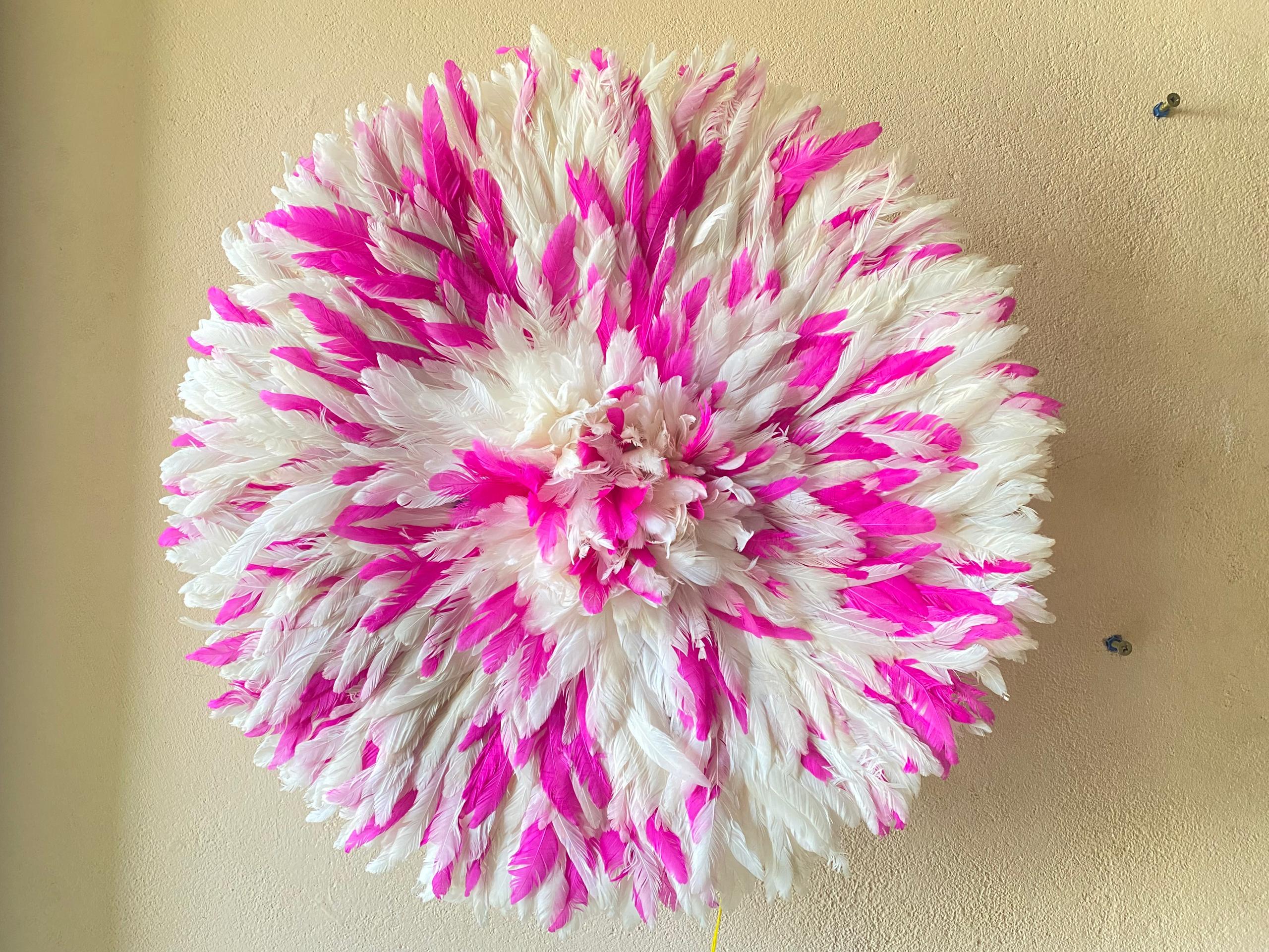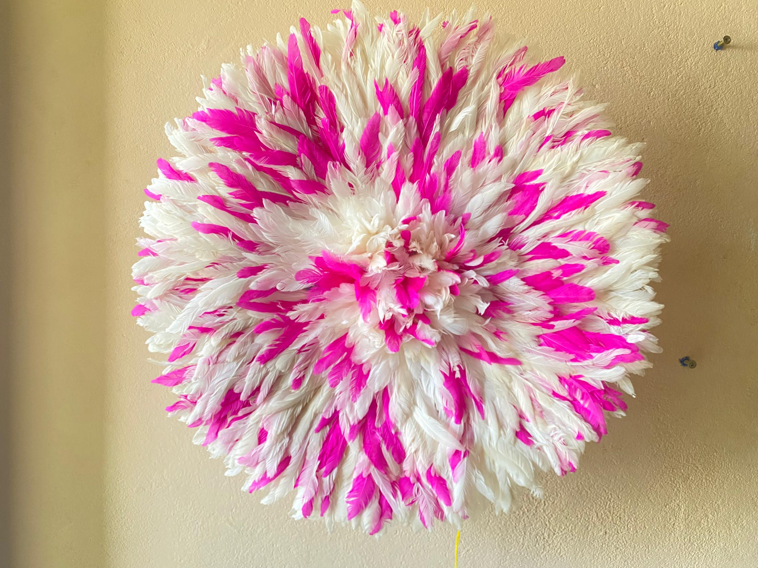 Transform your home with the exquisite White Juju Hat Wall Decor with fuchsia feather Speckle. This piece embodies elegance and culture!